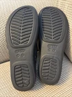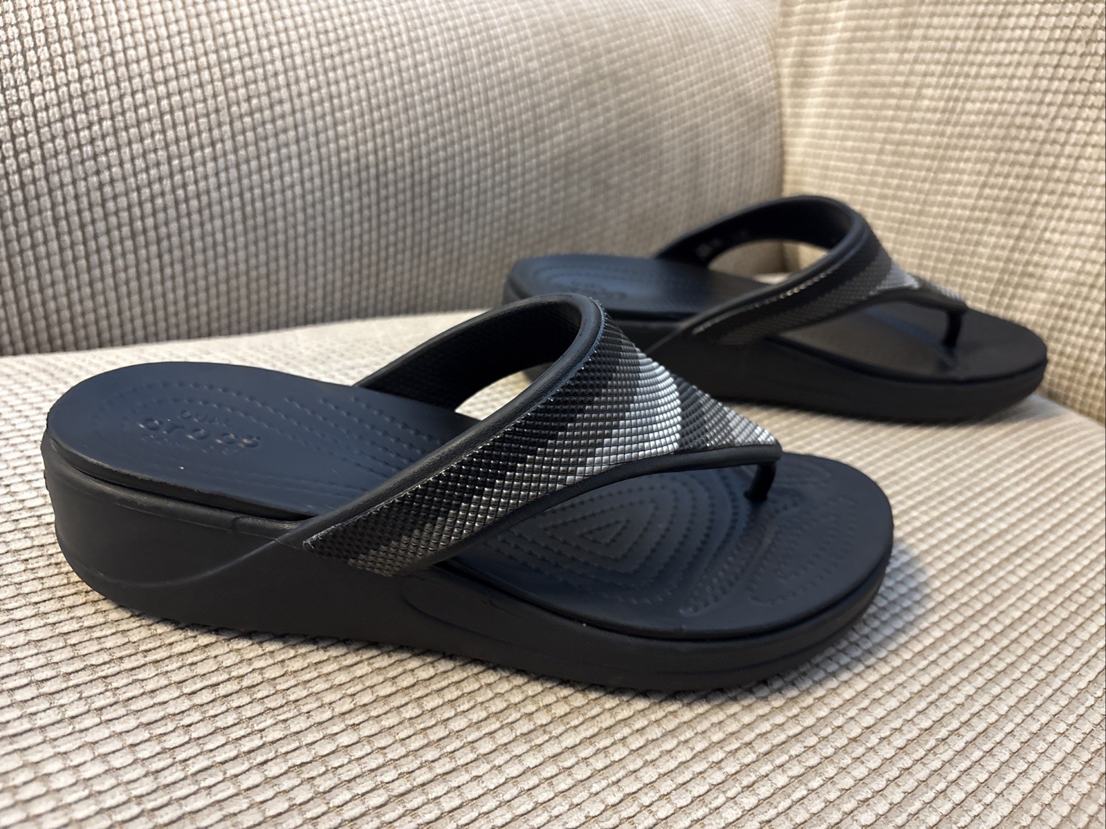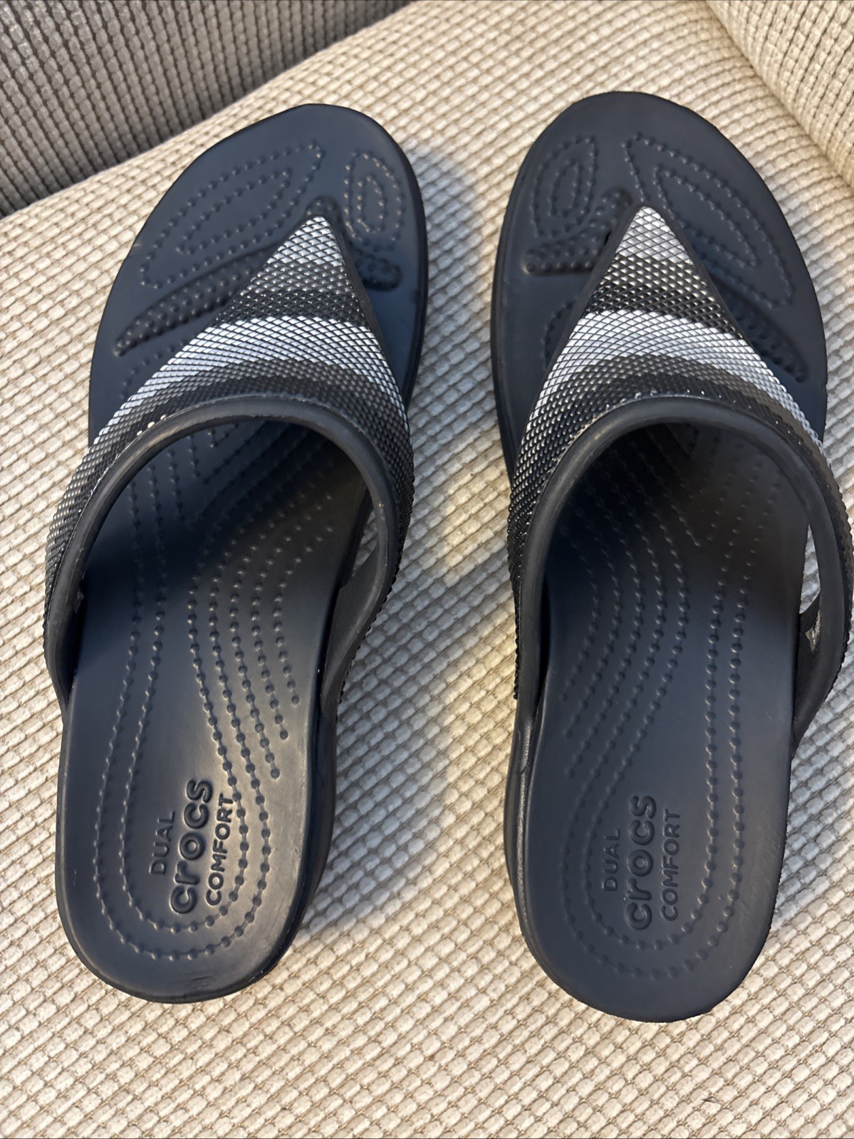 The Crocs Women’s Monterey Diamante Beaded T Strap Thong Wedge Flip Flop Sandals in size 8 are stylish and comfortable footwear for women. These sandals feature a striped pattern in black and gray, with diamante beads for added flair. The slip-on design and low wedge heel make them easy to wear for everyday activities. Made with Croslite material, these sandals are lightweight and cushioned for added comfort. Perfect for casual outings or lounging, these Crocs Monterey sandals offer a trendy twist on a classic thong style.