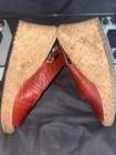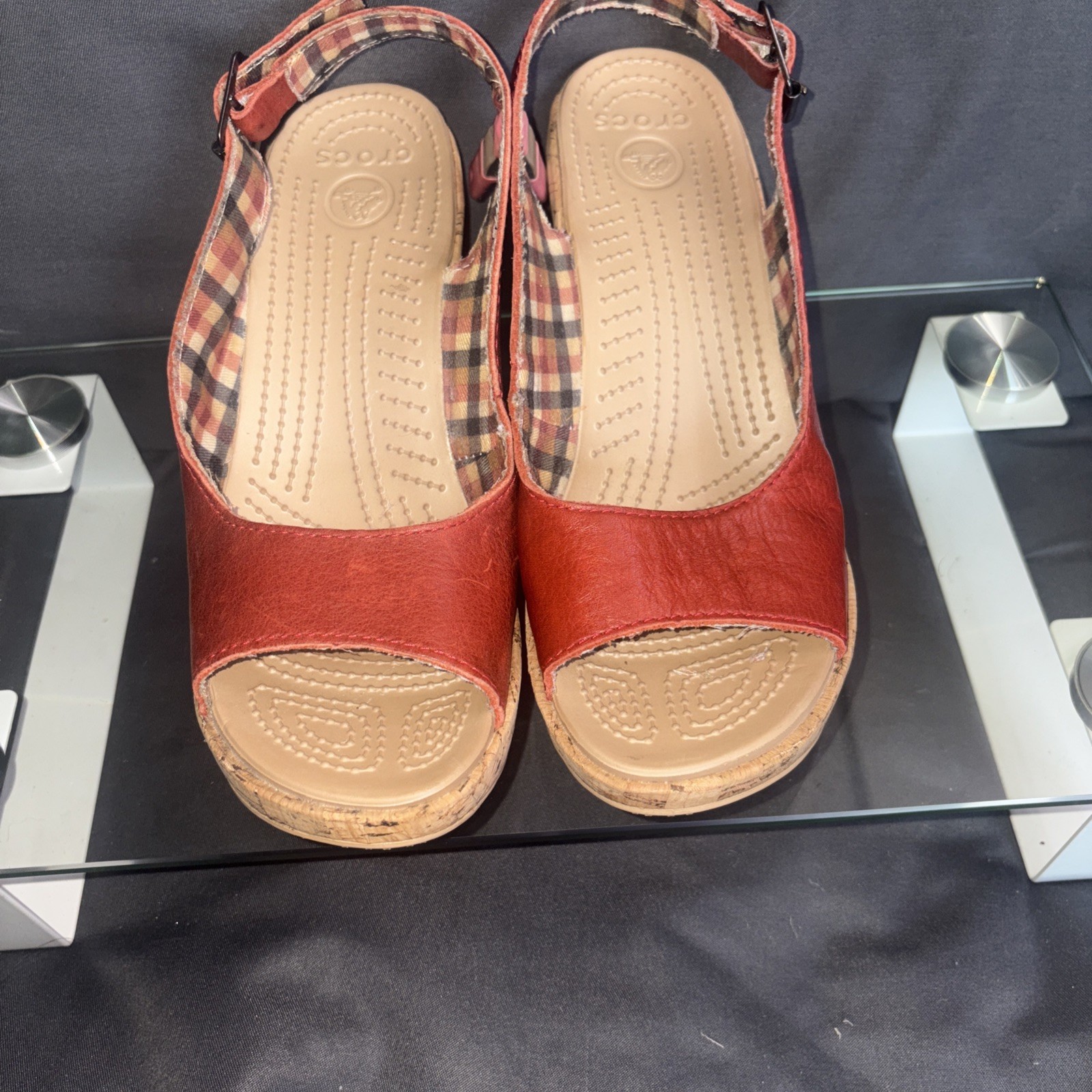 The Crocs Women’s Red A-Leigh Peep Toe Slingback Cork Wedge Heels in size 6 are a stylish and comfortable option for various occasions. These sandals feature a mid-height wedge heel, adjustable slingback strap, and a solid red color with logo accents. Made of faux leather with a foam insole, they are perfect for summer, fall, and spring. The Crocs A-Leigh model offers both comfort and a trendy design, making them a versatile choice for travel, activewear, parties, casual outings, or business events.
