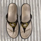 Crocs Women's Sanrah Silver Circle Slip On Thong Sandals in Brown, Size 10, are comfortable flip flops featuring medallion and logo accents. Made with a synthetic upper and outsole, they have a flat heel style and cushioned insole for added comfort. Ideal for travel or casual wear in any season, these gold sandals have a breathable lining and are perfect for outdoor activities. Brown with gold