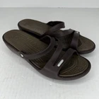 Step out in style with these fashionable brown strappy sandals from Crocs. Perfect for summer, fall or spring, these slip-on flats are made of high-quality rubber and come in a UK shoe size of 8, a US shoe size of 10 and EU shoe size of 42. The low heel height of 1-1.9 inches makes them comfortable for everyday wear and the rubber outsole material ensures durability. The Crocs Swiftwater model features a solid pattern with a beautiful accent strap that adds a touch of elegance to your outfit. Ideal for women, these sandals have a W shoe width and offer a personalized fit. Don't miss out on the opportunity to add these stylish sandals to your wardrobe. 100% CUSTOMER SATISFACTION IS OUR GOAL! Our items are always carefully examined for condition, measured if necessary, and photographed in a climate controlled and smoke-free environment. We make every attempt to accurately describe and clearly picture the items we have for sale. Please, ALWAYS view all of the photos. We value your business and our goal is your complete satisfaction. FAST SHIPPING All items are packaged with care and shipped out the same or next business day via USPS, FEDEX, or UPS with tracking numbers so you are always informed. RETURNS We offer a 30-day return policy. All items must be unused and unopened in the condition in which they were received, with original packaging, and all accessories included for return. REVIEWS - CUSTOMER SATISFACTION - COMMUNICATION We aim to make you happy. After you receive your shipment, please leave a positive review . If you have concerns or questions about your order, please contact us so we can resolve the issue. We will do our best to make you satisfied. THANK YOU FOR YOUR BUSINESS!