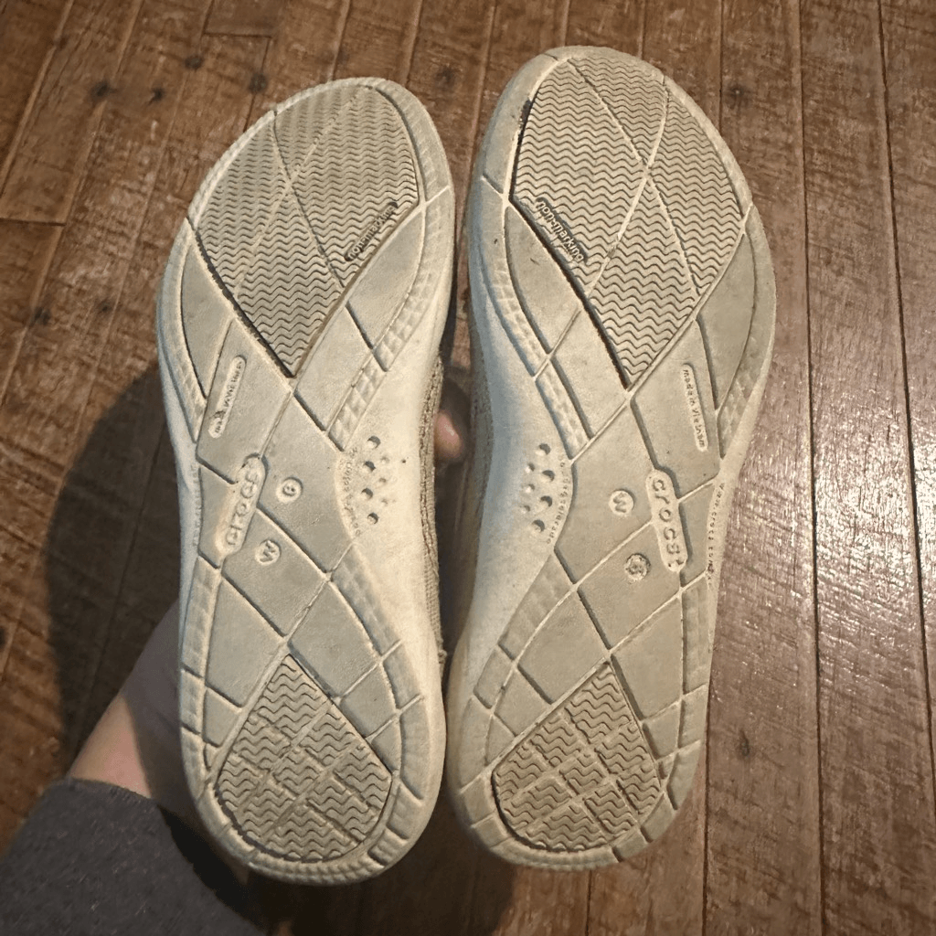 Crocs rubber, arch support, ortho, washable, tan/cream, slip on, loafers shoes. Minor wear, overall in good used condition. From a pet and smoke free house. Happy to bundle!