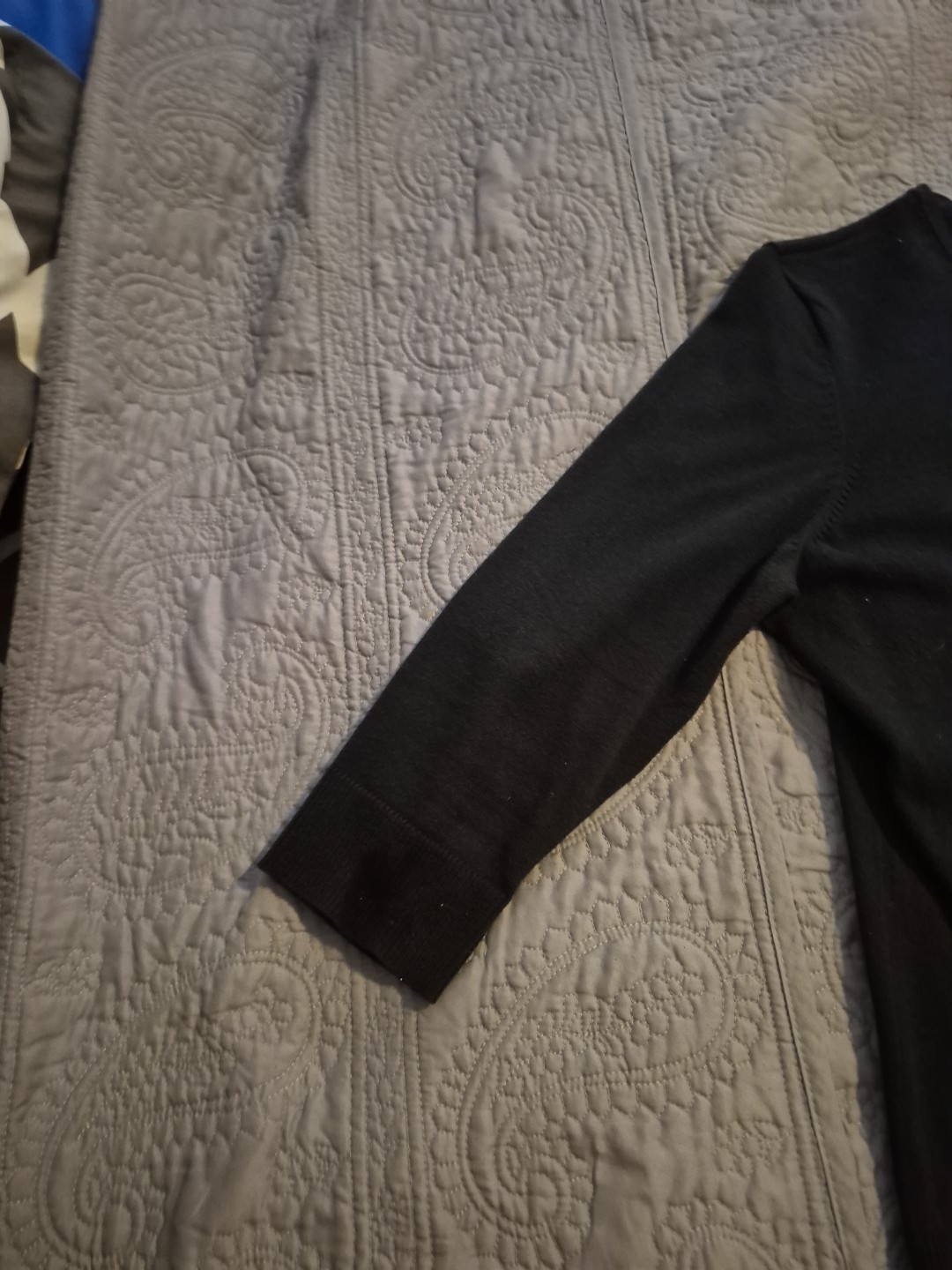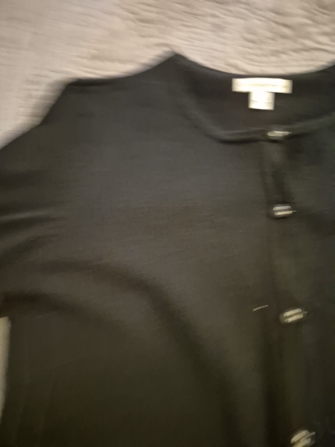 The Croft & Barrow Women's Cardigan in size M is a solid black sweater made from acrylic knit fabric. With long sleeves and button accents, it is designed for casual occasions during the winter and fall seasons. This regular fit cardigan is machine washable and features a classic cardigan style, making it a versatile and stylish addition to any woman's wardrobe. Perfect for adding a touch of warmth and style to any outfit.