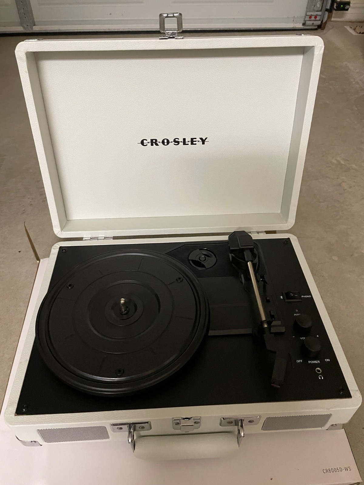 The Crosley Cruiser Deluxe is a fantastic portable turntable—sleek, compact, and packed with features like Bluetooth and RCA outputs. The white finish looks sharp, and it comes ready to play with cords, warranty, and even two vinyls. Perfect for vinyl lovers who want quality sound in a stylish, space-saving design. Highly recommend!