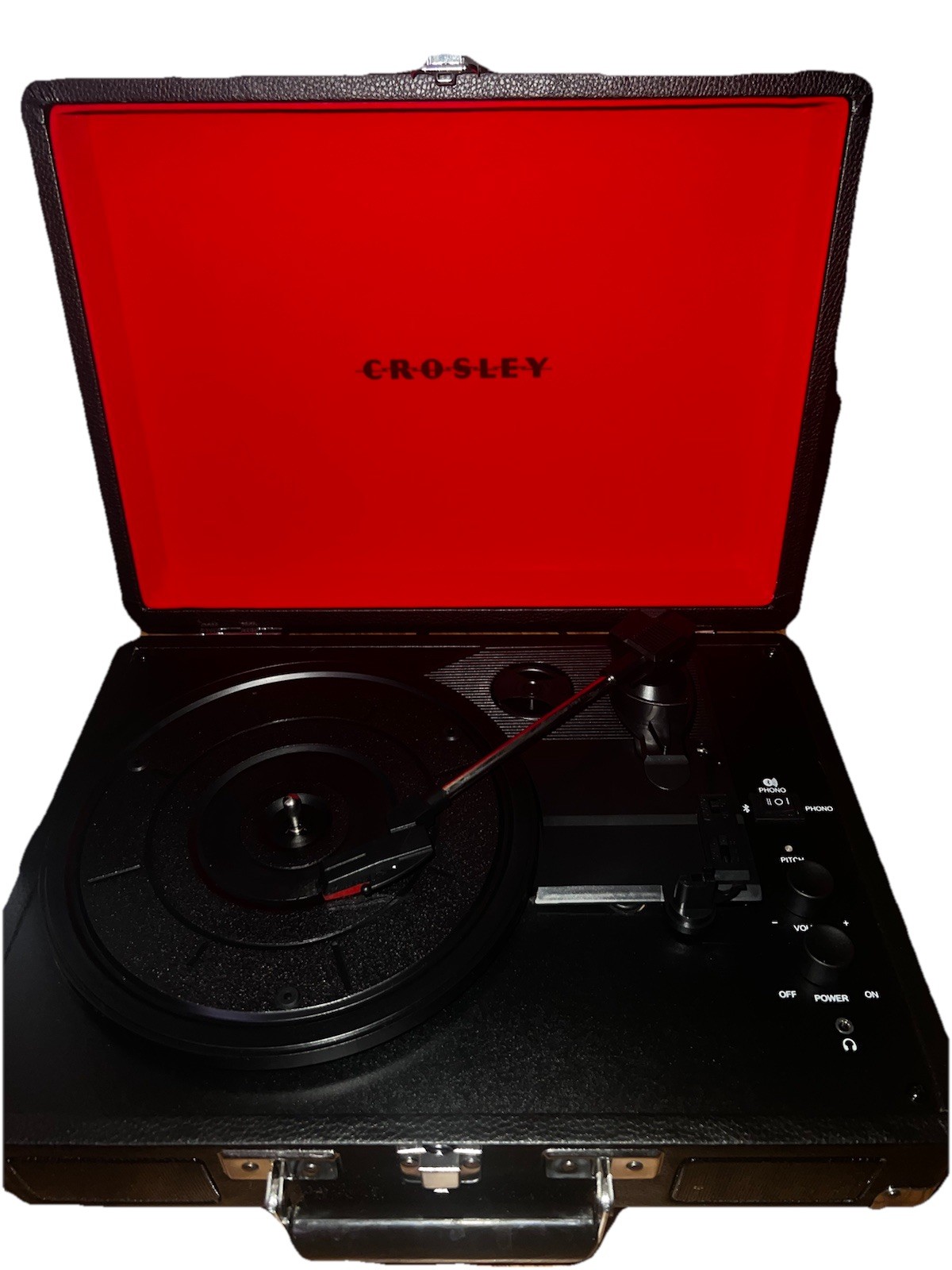 The Crosley Cruiser Plus Portable Turntable in black by Crosley is a sleek and stylish addition to any home audio setup. With Bluetooth connectivity and a headphone jack, this portable turntable allows for easy streaming and listening on-the-go. Its compact design makes it convenient for small spaces, while still maintaining high-quality sound performance. Perfect for music enthusiasts looking for a versatile and modern home audio component. Standard record size. Like new.