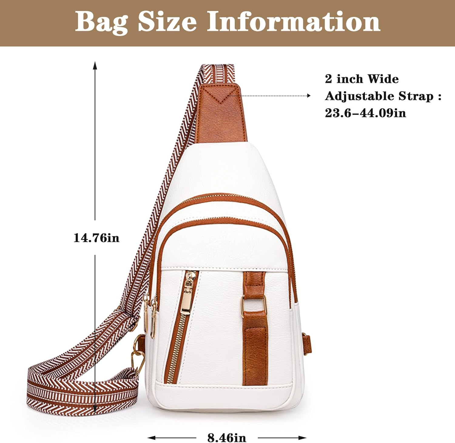 Widths:21.5cm---8.46in Height:37.5cm---14.76in 2 inch Wide Adjustable Strap : 23.6-44.09in Manual measurement, may be inaccurate