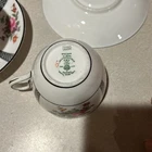 Beautiful Crown Staffordshire Bone China English Tea Cup & Saucer Set. 2 cups and 2 saucers Cup measures 2 1/2" tall with a 3 3/8" top diameter. Saucer is 5 1/2" in diameter. White base color with floral design spray and black trim with lattice lines. See pictures the black is worn.