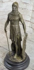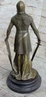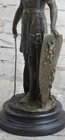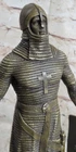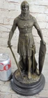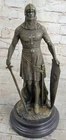 . Condition : This sculpture is in perfect condition. Bronze Dimensions with Marble Base: Height 15" X Width 6.5" Marble Dimensions: Diameter 6.5" Height without base:14" Weight: 11 LBS Inventory:91STE33476319 Introducing the striking bronze sculpture of a bold knight, poised to seize his adversary's castle with unwavering determination. Prepared for battle, he brandishes his mighty sword, ready to launch a formidable attack. Every aspect of his full armor has been meticulously crafted with exceptional detail and accuracy, showcasing the artistry of the sculptor. Adorned with a coif, a neck guard beneath his helmet, and an iron meshed gauntlet beneath his breastplate, the knight ensures maximum protection. His knees are safeguarded by knee cops embellished with two valiant lion heads, adding a touch of regal symbolism to the sculpture. This handmade bronze masterpiece has been shaped using the ancient lost-wax casting method, an age-old technique renowned for capturing intricate details and preserving the essence of the artwork. A brown patina finish enhances the sculpture's visual appeal while ensuring its long-term preservation. The sculpture stands proudly upon a black marble base, symbolizing strength and sophistication. Imprinted with the European Bronze Finery stamp of quality, it assures the authenticity and high standard of craftsmanship. The base also bears the signature of the talented artist, J.R Colinet, further solidifying its value and uniqueness. Embrace the spirit of chivalry and honor with this awe-inspiring knight sculpture, a testament to the timeless appeal of medieval legends. Make a bold statement in your home or office with this remarkable piece of art, capturing the essence of bravery and valor. Signed Lange Bold Knight Warrior With Sword Bronze Statue Sculpture Figurine Art www.bronzhaus.com Video will open in a new window Using the eBay App? Paste link into a browser window: [isdntekvideo]