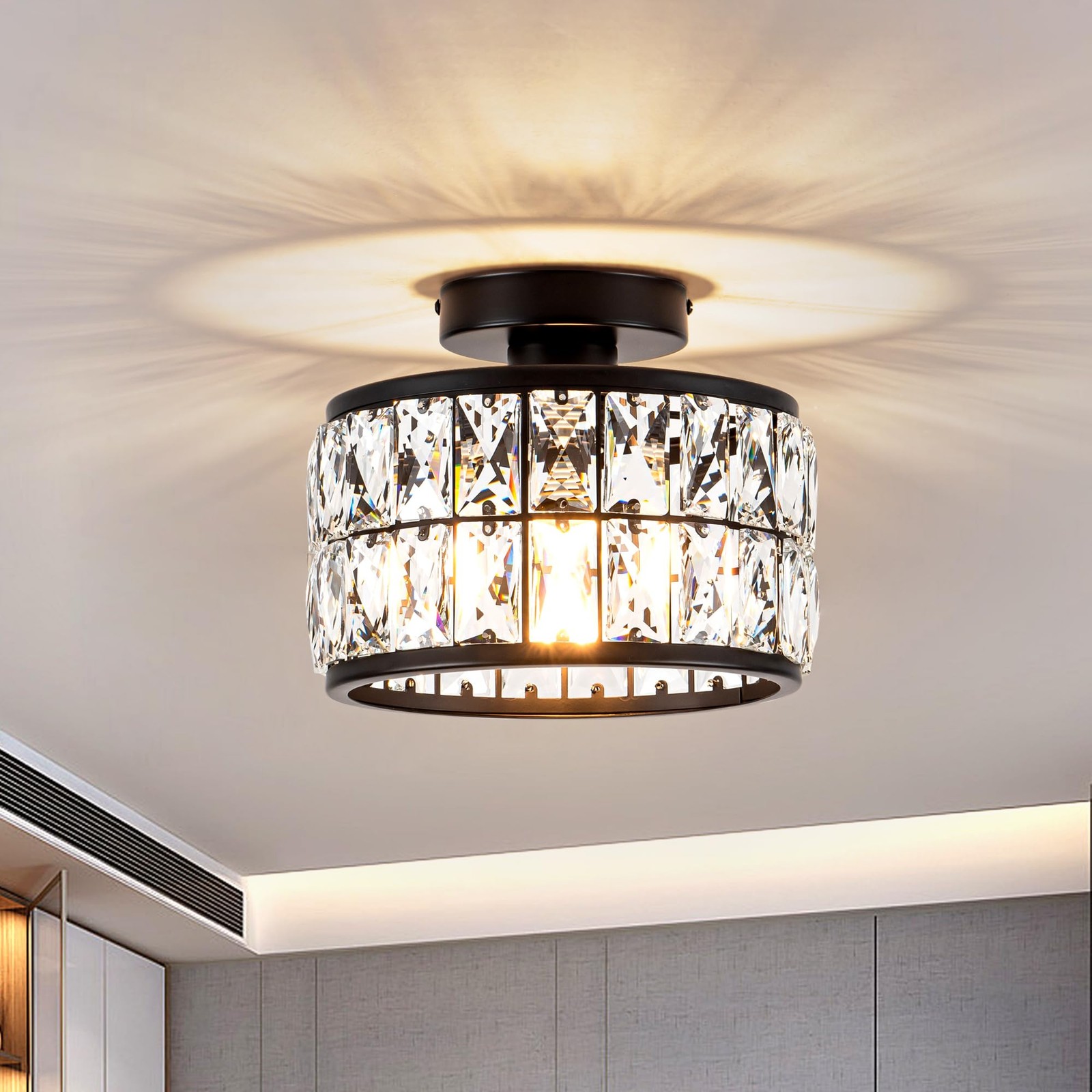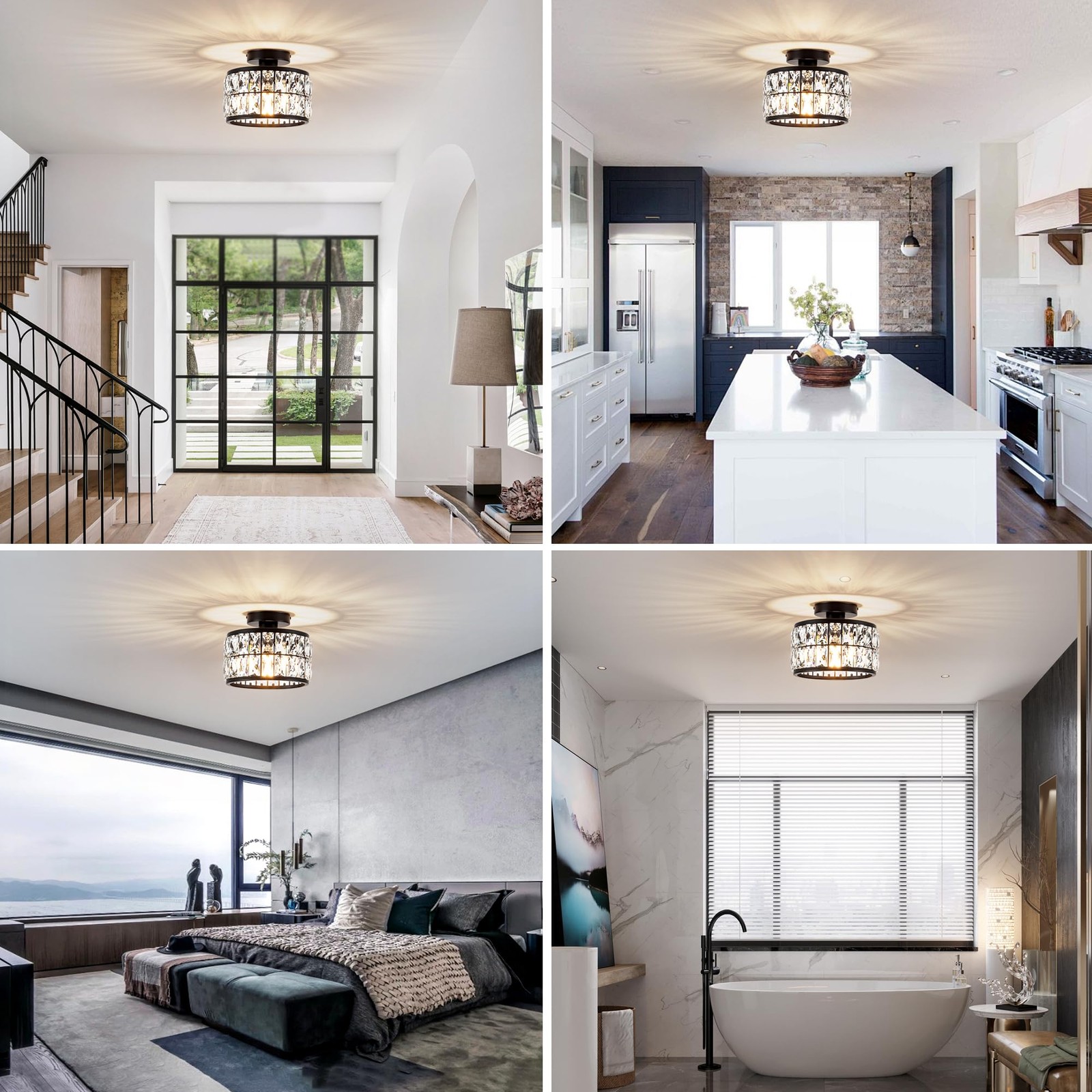 Crystal Ceiling Light Fixture, Modern Semi Flush Mount Ceiling Light, Black Crystal Chandelier for Kitchen Bedroom Bathroom Entryway 【Crystal Semi Flush Mount Design】This modern crystal semi flush mount ceiling light features black metal frame with crystal shade.The round metal construction and clear crystal decoration make this modern crystal ceiling light simple and luxurious yet elegant, while also reflecting the colorful light around the room in a clever way. Creating a comfortable and elegant atmosphere in your home. 【Modern Crystal Chandelier】Made of high quality metal material, this modern semi flush mount chandelier is very sturdy. We choose high quality clear crystal to ensure this black chandelier can not only deliver maximum illumination to your space, but also a fancy accent to complete your home decor. 【Wide Application】Dimension of 1 light crystal light fixture is D9.3*H7.2 inches(max). This entryway light fixture is both suit for flat and sloped ceiling. It will be a good ideal choice for space with most ceiling and can be put in any place as you want such as living room, dining room, hallway, foyer, kitchen, bedroom, entryway, porch etc. 【Compatible Bulb】This modern semi flush mount chandelier is compatible with E26 bulb(Max.60W),such as incandescent, LED, CFL and halogen bulb.You can choose different bulbs depending on the lighting effects you want.It could be dimmable with dimmer switch(*Bulb and dimmer switch are not included*) 【Great Service】This hallway light fixture is fully assembled, it comes with all the necessary mounting hardware, making it a simple, quick and easy installation. Your satisfaction is our first priority. If you have any problem, please feel free to contact us, and we will give you a satisfactory answer within 24 hours.