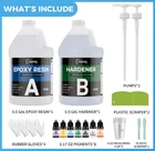 About this item Upgraded Formula for Crafters: Made by a professional resin manufacturer with full quality and safety certifications. Our upgraded epoxy resin formula is low odor and safe, ensuring a comfortable crafting experience. Hard Type & Non-Yellowing: Features excellent yellow resistance and 3X UV protection to keep your crafts beautiful for years. Achieves Shore hardness >85D after full curing, delivering a durable glass-like finish. Complete Epoxy Resin Kit: Includes 0.5 gal epoxy resin, 0.5 gal hardener, five 8 oz measuring cups, four rubber gloves, two plastic stirring sticks, two plastic scrapers, and eight 0.17 oz pigment bottles — everything beginners need. Easy to Use: Mix epoxy resin and hardener in a 1:1 volume ratio. Stir slowly until clear with no filaments, add pigments if desired, pour into molds, and cure for 24-48 hours. Wide Application: Perfect for festival decorations, jewelry, souvenirs, flower preservation, countertops, coasters, resin art, painting, woodwork, cutting boards, casting, coating, and many creative projects.