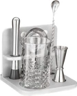 Crystal Cocktail Mixing Glass Set with Bamboo Stand - 22 Oz 650ml - Thick and Sturdy Bottom, Durable and Seamless Design with Bar Accessories IMPRESS YOUR GUESTS WITH STYLE: Mixing Glass features an etched diamond pattern and looks stunning in any bar. This classic ultra-clear mixing glass is an elegant and practical solution when you need to stir your cocktail instead of shaking it. SUPERIOR SEAMLESS DESIGN - The lead-free glass is handcrafted to avoid cracking like cheap machine-made mixing glasses. Its thick walls provide better insulation, and its capacity (22 Oz) makes it perfect for home bartenders to serve drinks to friends and family. DIAMOND PATTERN : The beautifully etched diamond pattern makes mixing easier, while the weighted base gives the glass more stability and balance. With both of these features combined, you can mix and pour cocktails with greater ease. STAND FOR BAR TOOLS: This unique bar tool holder features design dents and wood partitions, making it thick, stable, and solid PREMIUM STAINLESS STEEL BARWARE: A bar muddler, mixing spoon, double jigger, strainer and recipe card set complete the mixing process. Our bar essentials are practical, elegant, and durable. All are made of heavy gauge stainless steel with high end finishes. Home bartenders will love this cocktail kit!