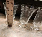 Elevate your table setting with this set of four vintage cordial glasses. Made of crystal, these glasses feature exquisite etched patterns with a floral theme. The glasses stand at 4 3/4 inches tall and are perfect for all occasions. The clear color of the crystal allows the intricate designs to shine through, making them a great addition to any drinkware collection. These glasses are a perfect representation of cut glass production style. They are a great addition to any vintage collection. Use them to serve juice or any other drink that you think will complement their beauty.