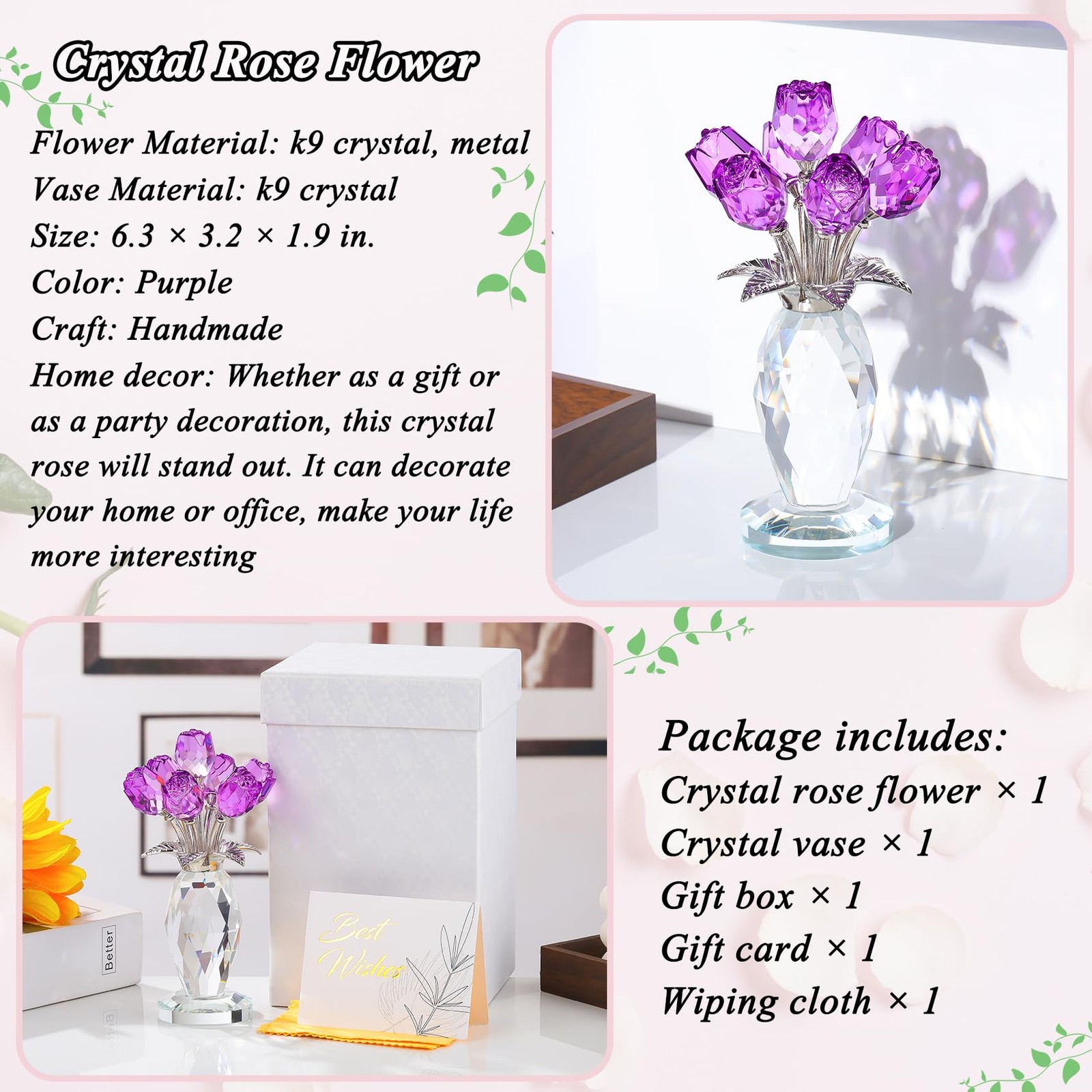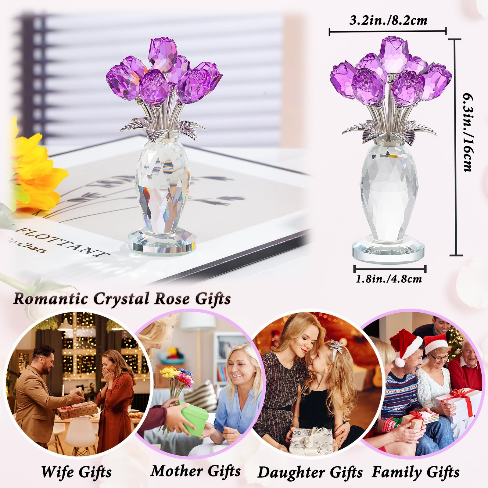 Crystal Purple Rose Flower Figurine with Vase, Handmade Romantic Rose Gifts Bouquet for Wife Mom Women, Glass Rose Flower with Stem Home Decor for Valentine Mother's Day Christmas Crystal Purple Rose Figurine: The petals and vase of the rose statue are made of K9 crystal, and the long stem and leaves are made of metal. This crystal purple rose flower figurine shows romantic love with its delicate rose shape. The crystal material is durable and not easy to fade or damage. The transparency and luster of the crystal gave this rose a vivid vitality Versatile Home Decoration: Size: 6.3 × 3.2 inches, the small crystal rose statue makes it suitable for a variety of home decoration scenes. Whether it is placed on a desk, a living room coffee table, or a bedroom bedside table, it can add a touch of elegance and romance to your home environment. It can also be used as a wedding or party decoration Handmade Exquisite Craftsmanship: The rose statue is handmade by our professional craftsmen, and the high-quality crystal has a good reflection effect. The rose can be given as a gift, handmade crystal crafts, photography props, art collections, crystal rose jewelry, and floral sculptures Perfect Rose Gift for Women: Whether it is a romantic gift for Valentine's Day, a gift for Mother's Day, a birthday gift or a festive decoration for Christmas, this crystal pink rose flower figurine is a very thoughtful choice. It is not only a beautiful gift, but also symbolizes affectionate blessings and sincere feelings, which can make the recipient feel your warmth and love Gift Box Package: This crystal rose figurine comes with a blank gift card and a wiping cloth. You can write any words you want to express on the card and use the wiping cloth to wipe the dust and fingerprints on the glass. Everything is packed in a white gift box Purple roses represent eternal, precious and unique love, expressing the unwavering love of lovers for each other, but also representing elegance and nobility, which can express love for a person. Crafted with K9 crystal, this pink rose figurine is exquisite and gorgeous, it is a great centerpiece for weddings, parties, celebrations, Christmas, office, etc. It is also the perfect gift for friends and family, on birthdays, anniversaries, Christmas, weddings, Mother's Day, and Valentine's Day for mom, wife, girlfriend, daughter, sister, or teacher, they will be very happy and touched when they receive the gift, we combine pure crystal with roses, our crystal rose bouquet home decor is a unique gift for your loved one that never fades and keeps your love alive. Product Specifications: Size: 6.3 × 3.2 × 1.9 in Material: K9 crystal and metal Craft: Handmade Package includes: 1 x Crystal rose figurine 1 x Gift box 1 x Gift card 1 x Wiping cloth Shipping We offer FREE shipping on all orders! We ship within Three business days of payment, usually sooner. We use a selection of shipping services such as UPS, FedEx, USPS etc. We only ship to the lower 48 states, no APO/FPO addresses or PO Boxes allowed. Local pickups and combined shipping options are not provided at this time. Return You can return a product for up to 30 days from the date you purchased it. Any product you return must be in the same condition you received it and in the original packaging. Please keep the receipt. Payment We accept payment by any of the following methods: PayPal Please pay as soon as possible after winning an auction, as that will allow us to post your item to you sooner! Feedback Customer satisfaction is very important to us. If you have any problem with your order, please contact us and we will do our best to make you satisfied. Contact Us If you have any queries, please contact us via ebay. We usually respond within 24 hours on weekdays. Please visit our eBay store to check out other items for sale! Thank you for shopping at our store.