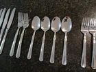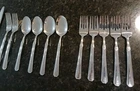 The product is a Cuisinart Stainless Flatware 15 Piece Set including forks, knives, and spoons. It features a glossy finish and is made of stainless steel. The set includes a fork, knife, and spoon with a stylish pattern design on the handles.