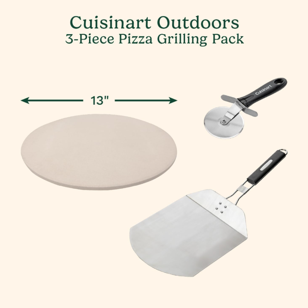 * Product details: Fire up perfectly crispy, grill-fired pizzas right at home with the Cuisinart Grilled Pizza Pack. This 3-piece set has everything you need to transform your grill into a pizza oven. The 13" cordierite pizza stone retains and distributes heat evenly, creating restaurant-quality crusts every time. The stainless steel pizza peel makes it easy to place and remove pizzas from the grill, while the sharp pizza wheel cutter provides quick, clean slices. Whether you’re hosting a backyard cookout or craving a homemade pepperoni pie, this set lets you enjoy rich, savory flavors without leaving home. Perfect for both grills and ovens, it’s a must-have for pizza lovers and grill masters alike. * More details: Product Care Instructions Hand Wash Only Included Components Pizza Wheel Cutter, Pizza Stone, Pizza Peel Unit Count 1.0 Count Manufacturer The Fulham Group UPC 642008392857 817096012080 827165660982 013219001539 971497923922 Global Trade Identification Number 00817096012080 Size 3-Piece Pizza Grilling Set Product Dimensions 14.57 x 2.56 x 15.16 inches Item Weight 5.66 pounds ASIN B00F3BH9Y6 Country of Origin China Item model number CPS-445 Is Discontinued By Manufacturer No