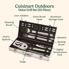 Elevate your grilling game with the Cuisinart 20-Piece Deluxe Grill Tool Set, a complete collection of BBQ essentials in one convenient kit. Crafted from stainless steel, this set offers professional-grade tools, including everything from a chef’s spatula and grill tongs to a high-performance grill cleaner brush and a digital temperature fork with LED light and alarm settings. Perfect for home barbecues, camping cookouts, or tailgates, the tools come packed in a sleek, durable aluminum carrying case, ensuring you have top-tier grill accessories wherever you go. Whether you're a seasoned chef or a weekend griller, this set equips you with all you need for flavorful, perfectly grilled food. Features COMPLETE 20-PIECE BBQ TOOL SET: Includes chef’s spatula, grill tongs, digital temperature fork, silicone basting brush, four pairs of corn holders, five skewers, a cleaning brush with an extra brush head, and more—all neatly organized in a stylish, sturdy aluminum case. Perfect for storage and portability. CHEF’S SPATULA & GRILL TONGS: The multi-functional spatula has a perforated surface for flipping, a serrated edge for cutting, and a built-in bottle opener for convenience. Durable stainless-steel tongs are designed for easily grabbing, flipping, and serving food with precision and ease. DIGITAL TEMPERATURE FORK: Ensures perfect results with preset temperature alerts, an LED light for night grilling, and an alarm to prevent overcooking. Say goodbye to guesswork! ALUMINUM CARRYING CASE: Our sturdy, stylish and compact aluminum carrying case perfect for easy transport and organized storage of all your grilling essentials. 18.5" GRILL BRUSH: The 18.5-inch-long brush with 14 square inches of stainless-steel bristles allows you to clean your grill faster with less passes and less fatigue!