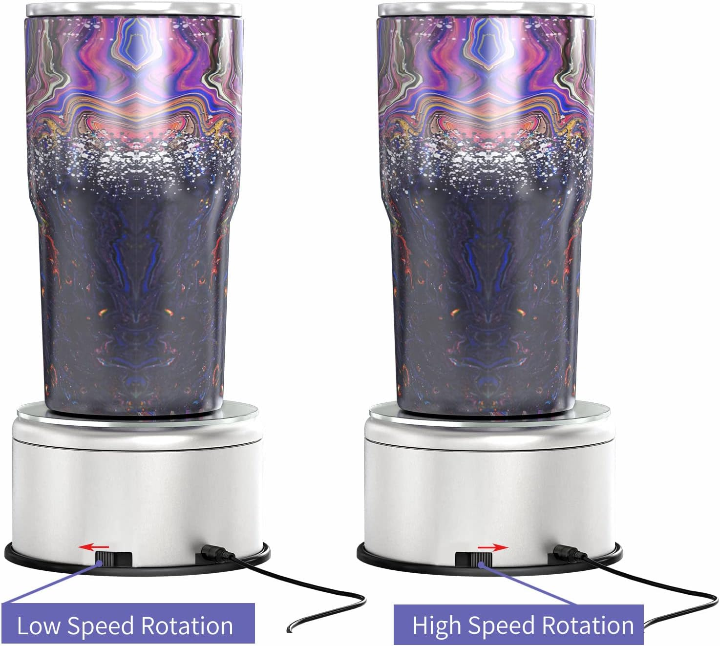Professional Tumbler Display Turntable - 360Β° revolution designed motorized tumbler turner machine, perfect for displaying bling bling epoxy glitter tumbler cups in all directions and angles. Much more alluring and attractive to draw people's eyes. A Must Have for Tumblers! - 2 different modes to choose rotation speed as your wish. Convenient and easy operation to turn off/on tumbler spinner stand through black switch. Mirrored top provide the perfect reflection effects to accent your tumbler cups. Sturdy & Strong Capacity - Rotating cup display turntable rotate much more stably, can easily hold 9, 10, 12, 16, 20, 22, 24, 30, 32, 40 oz tumbler cups of various different types, brands and sizes. Display cup turner for tumbler cups especially used in the home living room, souvenirs store, library, opening ceremony, anniversary celebration, supermarkets and exhibitions for advertising purposes. Battery & USB Operated - Silver tumbler turner machine is not only 3 * AAA batteries (not included) driven, but USB operated. Bonus USB AC adapter is included for standard outlet. Lower power consumption for durable use. Widely Used in Various Scenarios - Rotating display stand is environmental friendly, you can use it to display your cups in a window, shelf storage ,on a counter, tiered display shelf, or the floor. Suitable to family, office, retail stores, multiple shop, window display, solid display, superstore, exhibitions and for other advertising purposes Packing or home notion. Product Description 360 Degree Rotating Cup Display Stand Turner For Tumblers Specification: Item Name: Electrical Rotating Display Turner Rotation direction: Clockwise 360 Degree Power Supply: 3 * AAA batteries (not included) or USB operated Great auto-rotating display turner to showcase your tumblers glitter cups without holding & turning them with hands. You can take beautiful videos to display custom tumblers that you make. Welcome to share your DIY art videos with us. Can easily hold 9, 10, 12, 16, 20, 22, 24, 30, 32, 40 oz tumbler cups of various different types, brands and sizes. 360 Degree Rotating Display Base Premium Quality & Elegant Mirror Base Optional Various Charging Methods Comes with USB Cable and Adapter