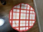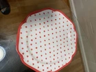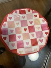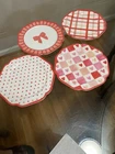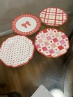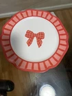 This is a set of four 8.5-inch round salad plates in a solid color pattern of pink, red, rose, white, peach, or lavender. Made of melamine, these plates feature a design theme of bows, hearts, and coquette elements, perfect for occasions like bachelorette parties, birthdays, or Valentine's Day. The plates are stackable, dishwasher safe, and have a modern style. Made by Cupcakes and Cashmere in 2024.