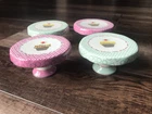 Present your delicious cupcakes in style with this set of four decorative ceramic pedestals from Julia Minasian. These round-shaped stands are perfect for all occasions and feature a traditional style that will add a touch of elegance to your party theme. Each stand has a diameter of 4 inches and a height of 2.1 inches, providing ample space to display your favorite treats. Crafted from high-quality porcelain/ceramic materials, these cupcake holders are not only beautiful but also food-safe. The set includes four cupcake holders making it an ideal choice for showcasing your sweet creations. Whether you are a professional baker or just love to entertain, this cupcake stand display set is a must-have addition to your collection. See pics. I have other items listed. Shipping in the continental US only. No PO Boxes please. All items canceled after payment will be charged a 10% restocking fee.