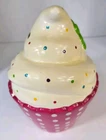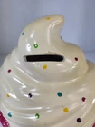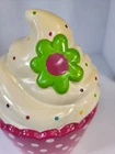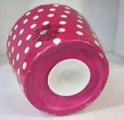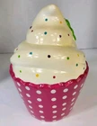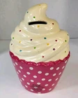 This is an adorable cupcake polka dot pink ceramic coin bank piggy bank by FAB Starpoint. Measures 7" tall x 5" diameter. It has paint chipping around the coin slot. See photos for best judgment.
