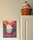 Cupcake painting bright colors kitchen wall art, dessert, 11x14 canvas with wood stretcher bars painted in bright acrylics. Shipped USPS First Class Package, carefully wrapped in double cardboard. This is a very bright cheery painting perfect for a kitchen wall. No need to frame as sides are also painted. All you need is a tiny finish nail to hang. Painting is hand drawn and painted by artist.
