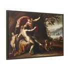 "Venus and Cupid with Hermes" – Renaissance Painting Reproduction Product Description: Celebrate the timeless allure of Greek mythology with this exquisite Renaissance reproduction featuring Venus (Goddess of Love) and her son Cupid (God of Desire) . This captivating scene showcases Venus in serene repose on her bed, with the enigmatic Hermes (God of Speed & Travel) hovering above her, symbolizing swiftness and communication. At the head of the bed, Cupid stands ready, embodying desire and affection, while Hermes' loyal dog companions ground the divine moment in companionship and loyalty. This museum-quality reproduction captures the intricate details and rich colors of the original masterpiece, printed in HDR on a premium cotton-polyester composite gallery-wrapped canvas . The proprietary matte finish coating ensures vivid, long-lasting colors and enhances the artwork's depth and texture, allowing every brushstroke to shine. Framed with a 1.25" espresso solid pine wood frame , the design provides a striking floating effect that elevates the artwork's presence in any space. The frames are made with sustainably sourced materials (Forest Stewardship Council certified) , offering a perfect balance of sophistication and eco-consciousness. This masterpiece is printed using UL-certified Greenguard Gold latex inks , which are non-hazardous, non-toxic, and non-flammable, ensuring a safe and environmentally friendly display. Arriving ready to hang , the canvas includes pre-installed sawtooth hardware for effortless setup. Whether you're an art enthusiast, mythology lover, or admirer of the Renaissance, this reproduction brings elegance, mythology, and timeless beauty to your home. Key Features: Greek Mythology-Inspired Artwork: Features Venus (Goddess of Love) and her child Cupid alongside Hermes (God of Speed & Travel) in an intricate Renaissance masterpiece. Premium HDR Printing: Museum-quality reproduction printed on a cotton-polyester composite canvas with a proprietary matte finish for vivid, long-lasting colors and exquisite detail. Elegant Espresso Frame: 1.25" solid pine wood frame with a warm espresso finish provides a stylish floating effect for enhanced visual impact. Eco-Friendly Materials: Crafted with sustainably sourced, FSC-certified pine wood and printed with UL-certified Greenguard Gold non-toxic inks for an environmentally conscious product. Ready to Hang: Comes with sawtooth hanging hardware pre-installed, making it easy to display right out of the box. Low Maintenance: Dust off gently with a clean, damp cloth to maintain its pristine condition. Custom-Made for Freshness: Each canvas is printed and framed after purchase, guaranteeing a new, untouched product. Perfect For: Adding a touch of Renaissance elegance and mythology to your home or office décor. Art collectors and mythology enthusiasts seeking timeless storytelling through art. Gifting to lovers of classic art or Greek mythology for special occasions. Transform your space with the elegance of "Venus and Cupid with Hermes" – a Renaissance masterpiece reimagined for modern interiors. Order now to own a timeless celebration of love, desire, and divine beauty! 4o