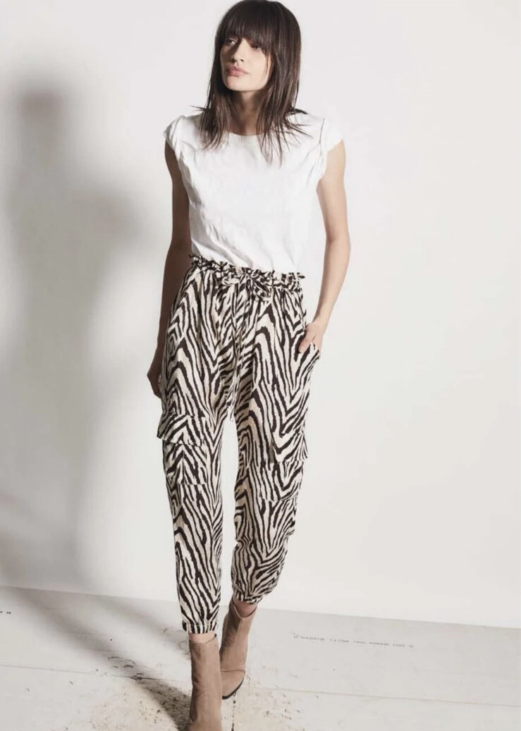 Current Elliot The Roxwell Pant in Zebra Stripe. Perfect condition - like new; fabric is smooth, crisp, and perfect! Fabric content/care tag has been removed. Bold but relaxed, these zebra stripe pants are pull-on ready, courtesy of that easy tie waist. Perfectly draped and fitted at the ankles for showing off your favorite shoes. These kind of have a harem pant style. Size 2 (Medium / US 6 / EU 38) ~27” across waist (you cinch the waist to fit) 25” across hips 16” rise ~28” inseam ~10” leg opening MSRP: $268 Style no. / 19-3-005724-pt01380 Adjustable tie waist Front slash pockets Button flap cargo pockets 100% tencel Machine wash gentle BB