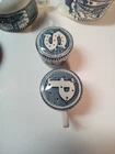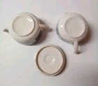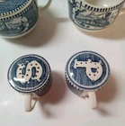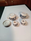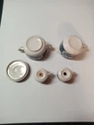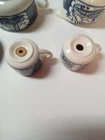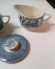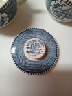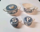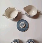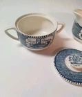This Currier & Ives vintage tableware set includes a blue & white ceramic sugar bowl with lid, creamer, and salt & pepper shakers. Each piece features a different classic farm-themed design, such as a buggy ride, train, and boat. The colonial style set is from the 1950s and is part of the Royal brand, showcasing glossy finishes and decorative handles. This four-piece set is a charming addition to any dining table, perfect for all occasions with its all-over blue & white pattern. These items are in good used condition with no chips or cracks. Stopper for pepper shaker is pushed inside it. See photos.