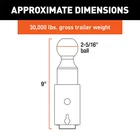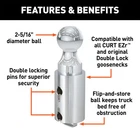 $ImageURL1$ Curt Double Lock Replacement Gooseneck Ball 2-5/16" Dia 30000 lbs GTW 60616 PART NUMBER: 60616 BRAND: CURT Manufacturing DESCRIPTION A CURT gooseneck hitch is more than a necessary tool for towing; it is an integrated extension of your truck that allows you turn your 4x4 into the workhorse it was designed to be. The CURT under-bed Double Lock™ gooseneck hitch is strong, fast and easy to operate. It gets its name from the two locking pins that engage the trailer ball and hold it in place, giving you twice the security when towing especially heavy trailers. This replacement gooseneck ball is designed to fit the CURT Double Lock™ gooseneck hitch #60607. It features a tough chrome-plated finish to stand up to the strain of heavy-duty towing and is tested to meet U.S. V-5 specifications. It also features a 2-5/16" ball diameter to fit most gooseneck trailers. FEATURES Replaces gooseneck ball in Double Lock gooseneck hitch #60607 2-5/16" diameter ball couples to most gooseneck trailers Accepts up to 30,000 lbs. GTW and 7,500 lbs. vertical load limit Double locking pins for superior trailer and trailer ball security Flip-and-store ball keeps truck bed free of obstruction Protected by a durable chrome-plated finish Tested for safety to meet U.S. VESC V-5 specifications