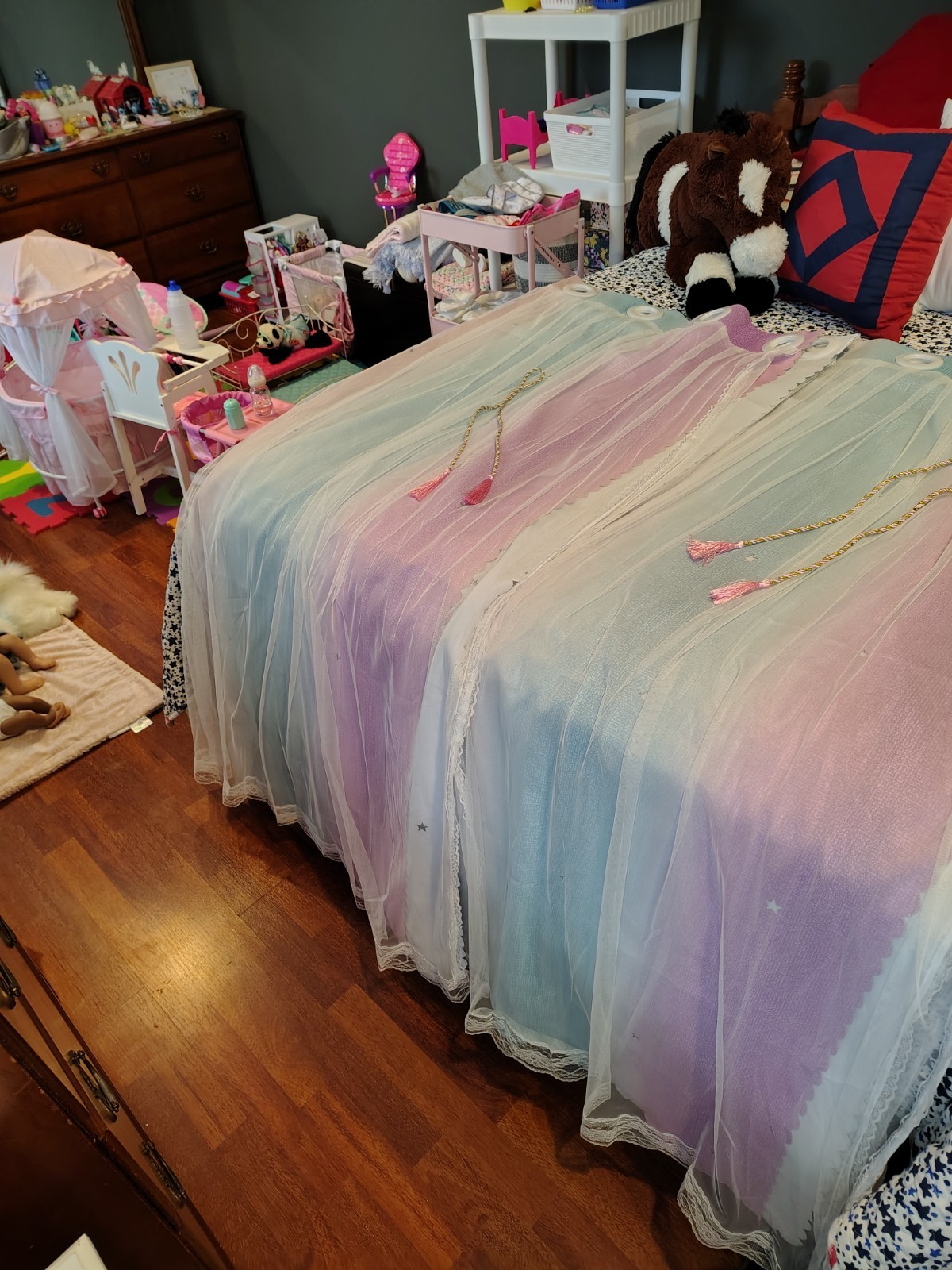 Best quality curtains I have ever ordered for a kids room. Very versatile for how you can hang them. There are sheer lace panels in the front with tie ropes to pull together. The top panel under the lace has cut out stars that the light shines through from the bottom panel.