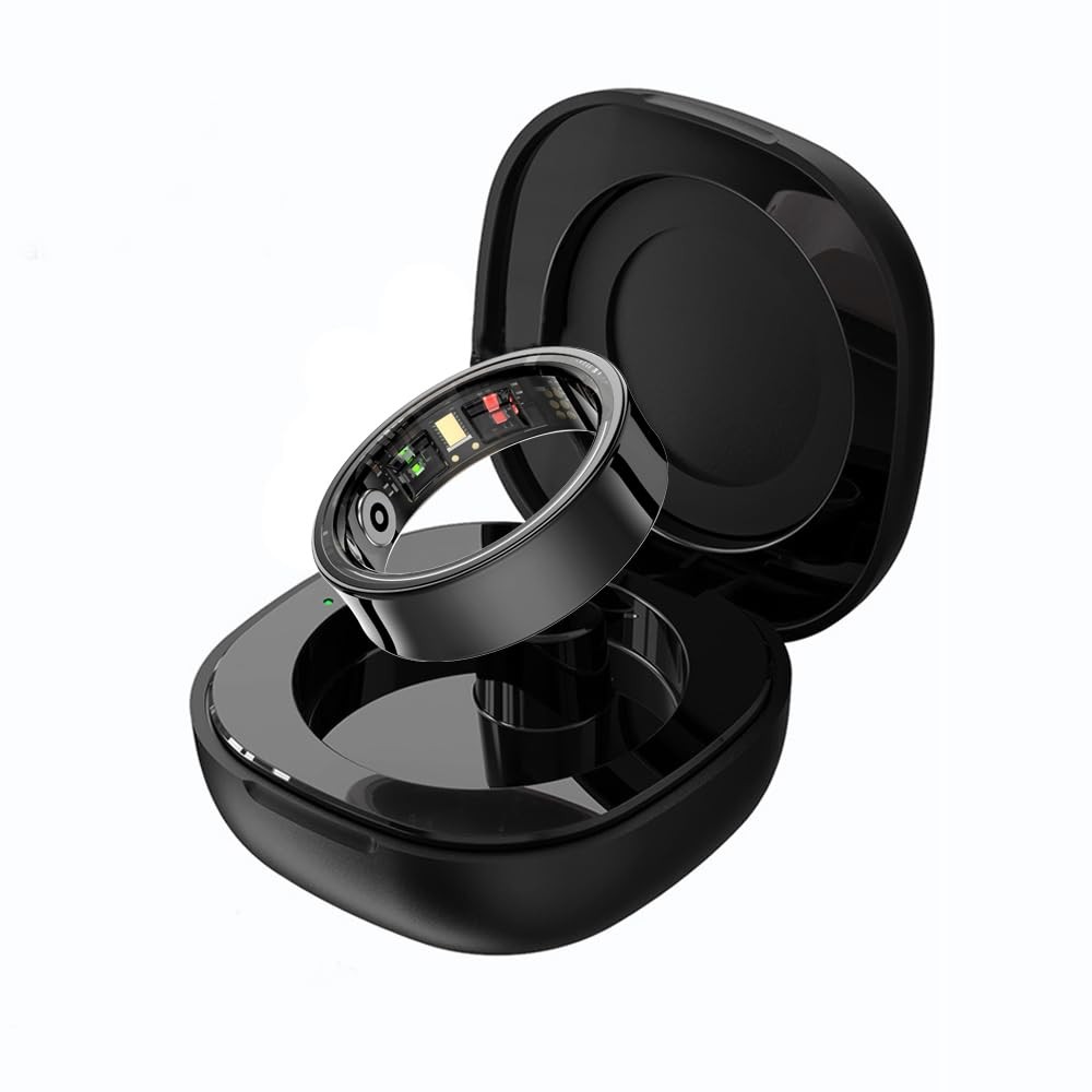 Stainless Steel Frame Curved Design Smart Ring Fitness Tracker Activity Sport Record Sleep Quality Heart Rate SpO2 Skin Temperature Monitoring with Charging Case 【Long Battery Life + Charging Case】Our smart ring comes with 7days long battery life, and it comes with a Charging Box which can charge the ring with 12times. If your charging box and ring both full charged, then you don't need more charging for about 30days, and this will ensure you to handle your body situation always for business traveler or outdoor enthusiast. 【IP68 Waterproof】The smart ring health tracker features IP68 waterproof rating, withstanding depths of up to 50 meters. Whether you're washing your hands, showering, swimming, or hiking in the rain, you don't need to remove the ring, allowing you to monitor your health data anytime, anywhere. 【Health Monitoring】The smart ring is equipped with a high-precision and high-performance heart rate sensor, which can monitor your heart rate, sleep quality, skin temperature etc., 【Multi-Exercise Modes and Fitness Tracker】The Smart Health Ring tracks your activities throughout the day with high precision. For example, the Fitness Ring tracks your steps, distance walked and calories burned. In addition, the Smart Ring features different exercise modes such as walking, running and cycling. The ring tracks and scores your activities to encourage a more active lifestyle! 【Confirm Size Before Purchase】Please refer to the size chart in the images to select the appropriate size for you. Note that the Smart Ring is intended for everyday health monitoring and is NOT a substitute for professional medical devices. 【Gesture Control Features】Once you've enabled AssistiveTouch, you can operate apps like TikTok, control music, or take photos with simple finger gestures—just shake your finger. No need to touch your phone! 【Women’s Health Tracking】Stay informed with menstrual and ovulation reminders, using body temperature and cycle data to provide accurate and timely predictions for women’s health management.