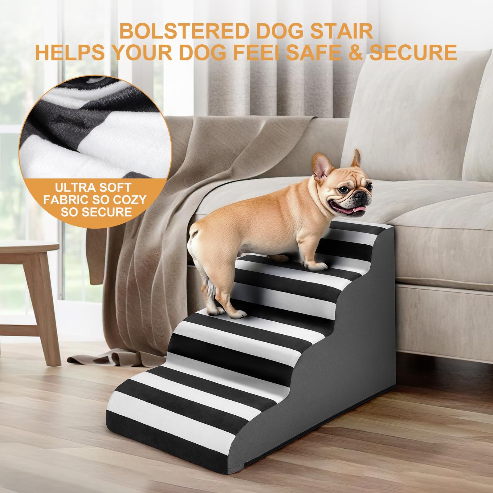 Curved Dog Stairs Ramp for High Beds, 4-Step Dog Steps for Small Dogs and Cats, Pet Stairs for High Bed Climbing, Non-Slip Balanced Pet Step Indoor COMFORT AND CONVENIENCE: dog stairs for small dogs are ergonomically designed to rest snugly against beds, sofas, or furniture, offering maximum comfort for pets climbing up and down. Ideal for dog steps for bed scenarios, these pet stairs reduce joint strain while providing a practical solution for stairs for dogs to get on bed. Perfect for small and medium dogs and cats AVAILABLE IN 3 SIZES: Choose from three versatile sizes of dog stairs for bed: 3-step pet steps: Perfect for low furniture (up to 17 inches). 4-step dog stairs: Ideal for medium-height beds or car trunks (up to 21 inches). 5-step dog steps for high bed: Designed for tall beds or cars (up to 24 inches), catering to dog stairs for large dogs and pet stairs for high beds SAFE AND SOLID: Crafted from 30D high-density foam, these dog stairs support up to 35 pounds, combining durability with joint-protecting cushioning. The lightweight yet sturdy structure ensures steps for dogs to get on bed stay stable indoors or outdoors—whether used as pet stairs for high beds or portable ramps for travel STABLE AND NON-SLIP: Featuring an upgraded anti-slip base, dog steps stay firmly in place during use. The sides are wrapped in scratch-resistant cotton-linen fabric, making them ideal for energetic dog stairs for small dogs. Built to last, these pet steps ensure safety and durability for years REMOVABLE AND WASHABLE COVER: The ultra-soft, machine-washable cover on dog stairs for bed simplifies maintenance. Simply unzip and wash the outer layer (avoid washing the foam core). Perfect for dog steps for high bed users, this feature keeps hygiene effortless in busy households