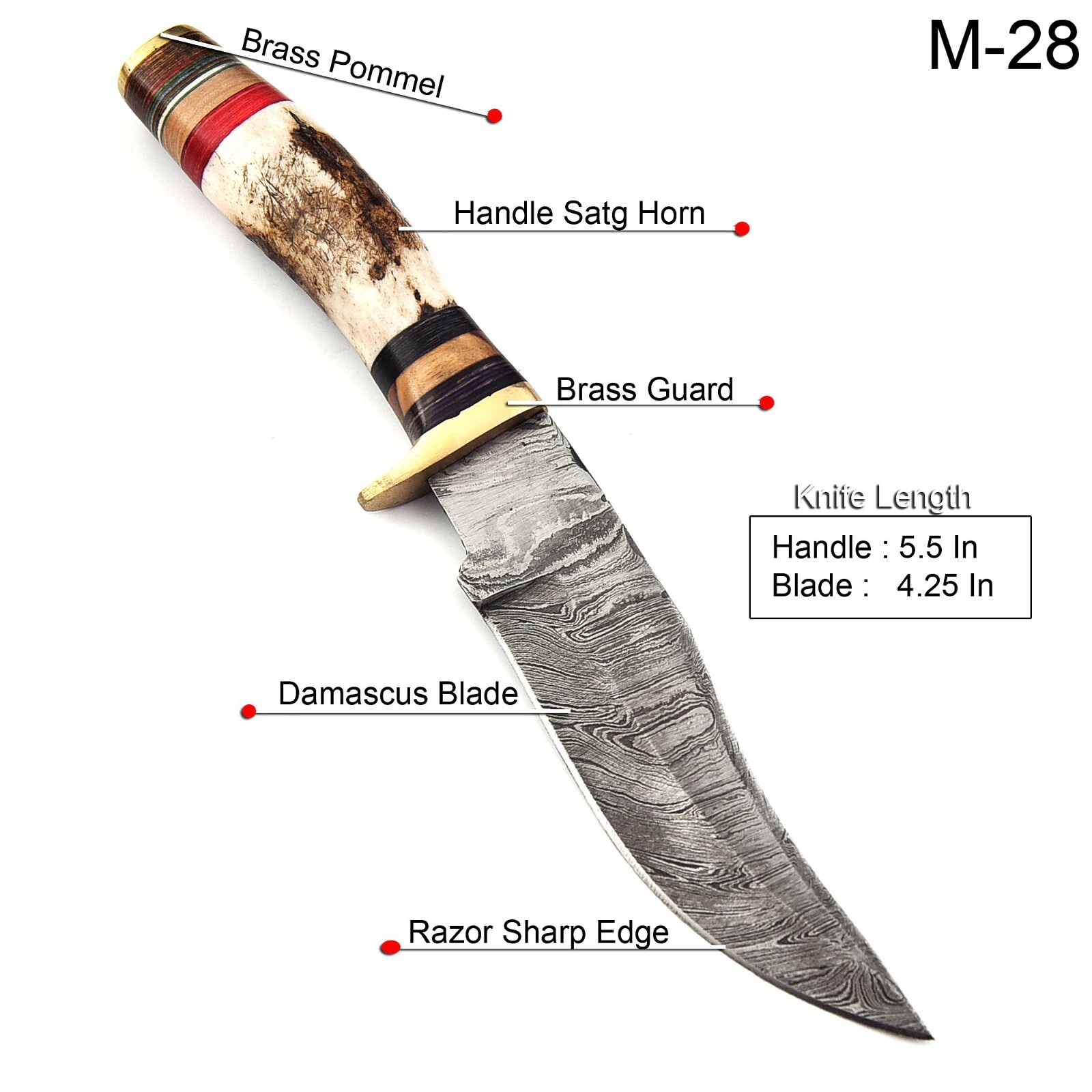 Description: CUSTOM HANDMADE HAND FORGED STAG HORN DAMASCUS STEEL Hunting KNIFE Specifications: Handle Material : Stag Horn + Brass Blade Material : Damascus steel Overall Length : 9.75 inches Handle Length : 5.5 inches Blade Length : 4.25 inches Layers: 512 Sheath: Leather Hardness: 55-58 HRC This superb design knife is hand forged. Blade of this knife has a nice file work and is made of 512 layers of stainless steel and high carbon steel with hardness 55-60 HRC. This process takes approximately 48 hours to complete. This robust knife is lab tested under intense conditions, the balance and shape of this knife ensures perfect grip. All our knives are handmade similar to the photo, differences as such as color and patterns of the natural materials used will differ somewhat because these are all natural materials. Every item will be considered as an original because no one item is ever identical to the other, they are handmade and natural materials are never identical. Because they are handmade they may have slight imperfections because they are NEVER MACHINE MADE and this makes it original in its own way. Package Includes: Knife with Original Leather Sheath AGE RESTRICTION: WE DON'T SELL KNIVES TO ANY ONE WHO IS UNDER AGE 18. WHEN YOU BUY A KNIFE FROM US YOU ARE CONFIRMING THAT YOUR AGE QUALIFIES FOR THIS PURCHASE AND THIS IS A LEGAL PURCHASE. Lift US TAKES NO RESPONSIBILITY FOR ANY ILLEGAL PURCHASE. Care Instructions: Keep the knife dry after each cleaning. Warning: Take care when removing product from packaging. Keep fingers clear of blades. Store away from children. We are not responsible for injuries caused by the use of this item. FEEDBACK POLICY: YOUR FEEDBACK IS VERY IMPORTANT FOR US, IF THEIR IS ANY KIND OF PROBLEM PLEASE GIVE US OPPORTUNITY TO SORT THE ISSUE We do sell wholesale, please contact us for special discounts on bulk orders. Best Regards TrendCutd
