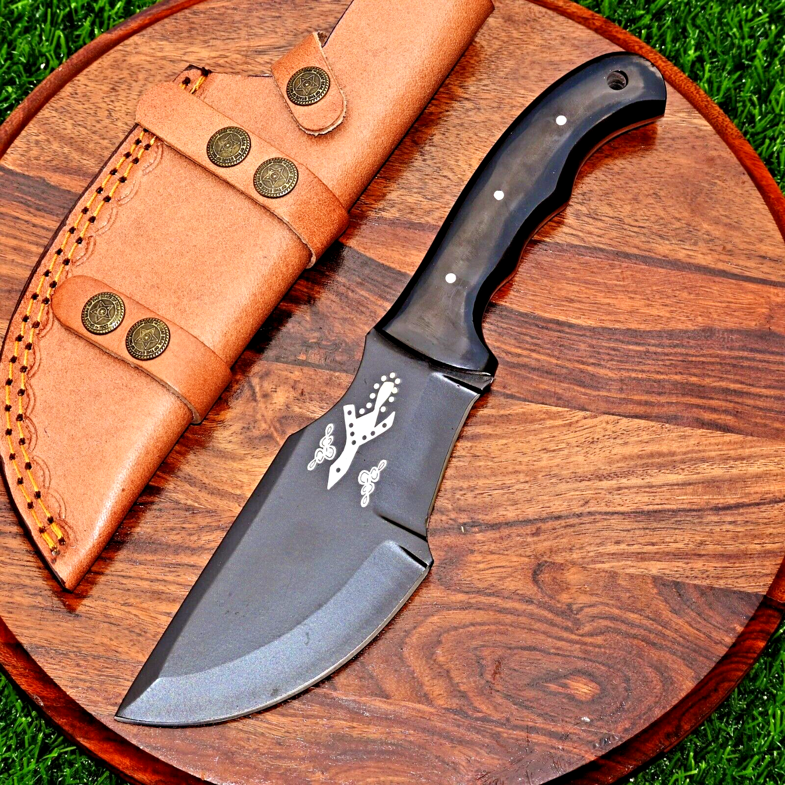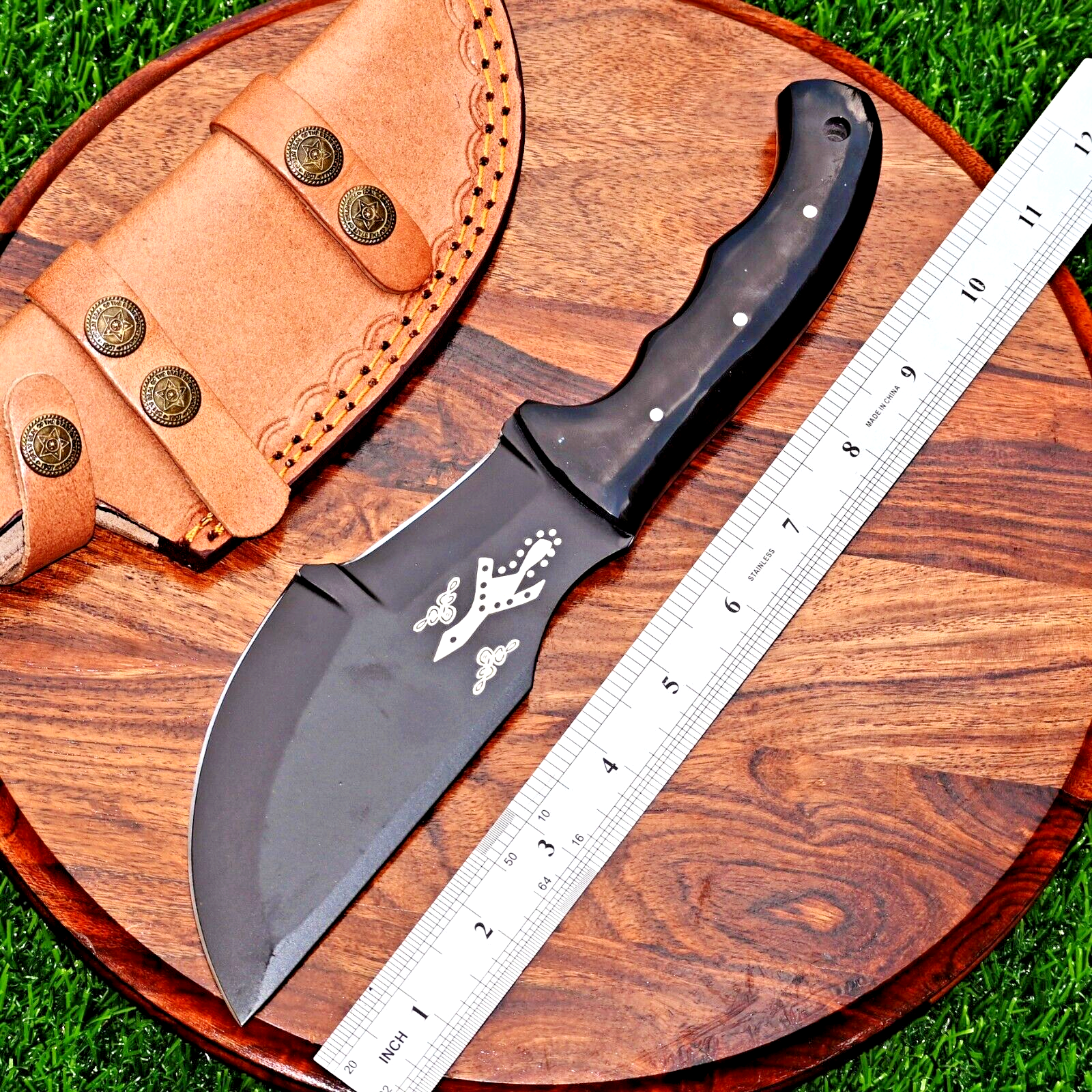 CUSTOM HAND MADE HIGH CR12 STAINLESS STEEL HUNTING TRACKER KNIFE Bull Horn Handle This superb design knife is hand forged. Blade of this knife has a nice file work. The balance and shape of this knife ensures perfect grip. Overall Length: 11” Inches Blade Length: 6 ”Inches Handle Length: 5 ”Inches Package Includes: with Leather Sheath Warning: Keep fingers clear of blades. Store away from children.