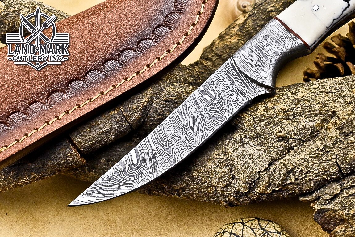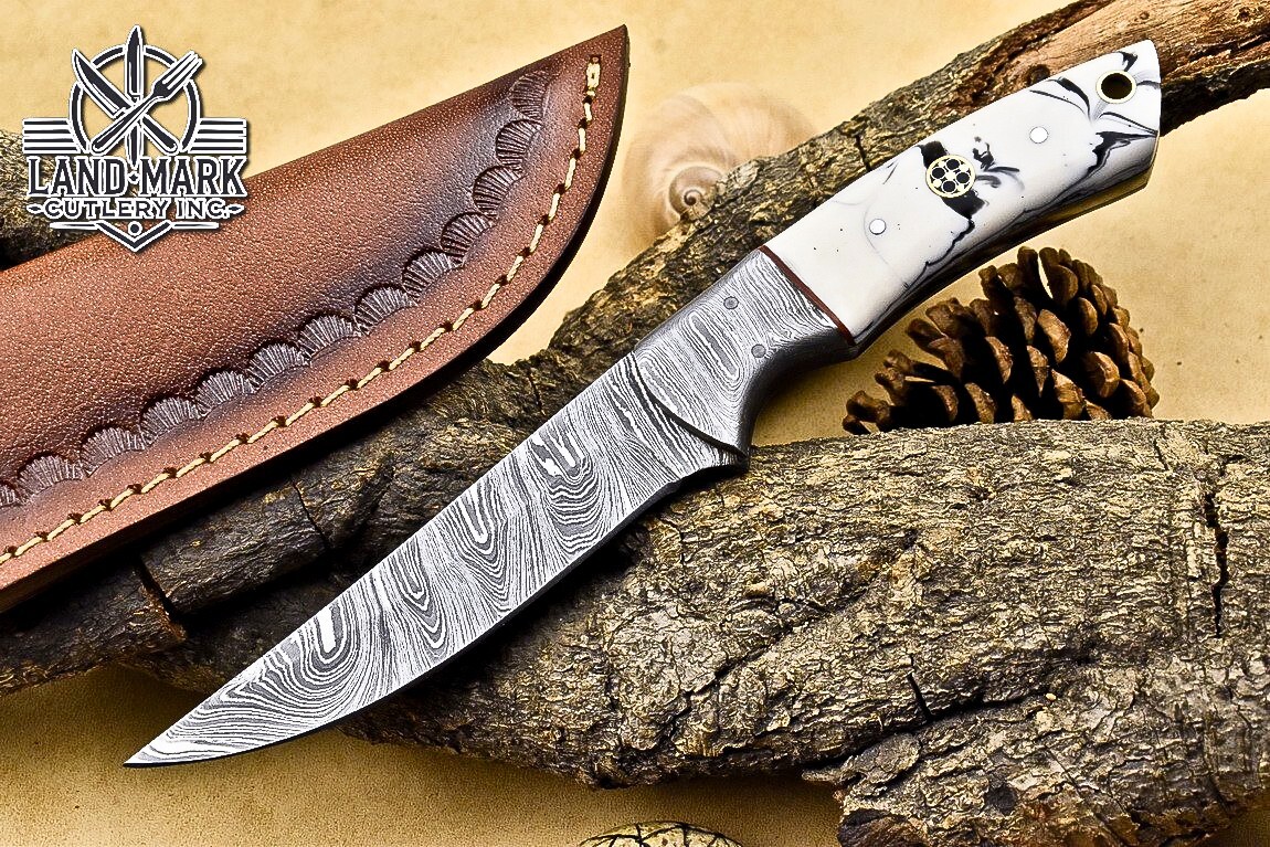 Custom Hand Made DAMASCUS STEEL HUNTING KNIFE WITH RESIN HANDLE We offer a shipping discount for More then one purchased . And discount will be apply on combine invoice, Discount will not apply on separate payment. ITEM DETAILS OVER ALL LENGTH 8.0 inches long (Approx) HANDLE LENGTH 4.0 inches long (Approx) BLADE LENGTH 4.0 inches long (Approx) BLADE HARDNESS 58-60 HRC Which Holds The Sharp Edge For Long Time. HANDLE RESIN COVER LEATHER SHEATH This Awesome custom made KNIFE has a nice hand forged with the combination of 4340 & 1080 steel. HOW OUR DAMASCUS IS MADE: All our Damascus is real and not just an acid etch. Damascus is a mixture of 1080HC and 4340 nickel carbon. You heat them up together and then fold the bar over and over to get the desired layers, ours are 396 layers. Then you burn the blade in acid, and it turns the nickel satin color and the high carbon turns blackish gray. This is how the layers are exposed to show the layers of the new steel created coined "Damascus". All Damascus is acid etched to show the layers. If you high polish the metal it will be shinny satin like all steels. Only after you burn the sides of the blade with acid do you see the layers of the two steels. Makes sense? After we make our knives we high polish the handles and put an edge on the blade. The high polishing buffs off the acid burned layer of the handle, and the blade edge is sharpened and the acid burned edge becomes satin. You can re-burn the tang of the blade near the handles and the edge of the blade and it will show the layers once more. All our knives are hand made, durable and unique ***** YOU WILL RECEIVED THE SAME KNIFE Qality Standards Our Damascus blades are made from high quality non-stainless steels which rival or exceed any Damascus blade made from the 10 series with 4340. Our Damascus combination has taken years to perfect and has been tested under a variety of application which will offer professional performance in categories of toughness, strength (lateral stress) and edge honing and holding ability. In a 5 spot Rockwell test our blades will average near or close to 58 which offers a perfect balances between its toughness and strength.Our blades due to carbon content need to be regularly treated with wax and/or 3 in 1 oil to maintain its superior quality. Questions if you have any question feel free to send us message we aim to answer all questions within 24 hours Feedback If you are not satisfied with our service please contact us before leaving any negative or natural feedback. We will resolve all issues as quickly as possible. Disclaimer We are not responsible for any injuries associated with the use of our tools. Our products are intended for legal use only by responsible buyers. Therefore, we will not sell our products to anyone under the age of 18. Before bidding please check your country laws as some countries Custom don't allow this. If your purchase is held by Custom Authorities in your country/State we will not be responsible for that and no refund will be issued Shipping We offer a 20% shipping discount for More then one purchased . And discount will be apply on combine invoice, Discount will not apply on separate payment We ship within 24 hours after receiving complete payment but this can be delayed due to week ends or Governments and Religious Festivals . . This is beyond our control and we apologize for this inconvenience. Precautions Our Tools are very sharp so open and use them very carefully We are not responsible for any injuries associated with the use of our tools Tips to Care knife 1. NEVER STORE YOUR KNIFE FOR LONG TIME IN LEATHER SHEATH. 2. LEATHER CAN ABSORB WATER, WHICH WILL RUST THE KNIFE. 3. ALWAYS CLEAN THE BLADE AFTER USING WITH OIL OR WAX