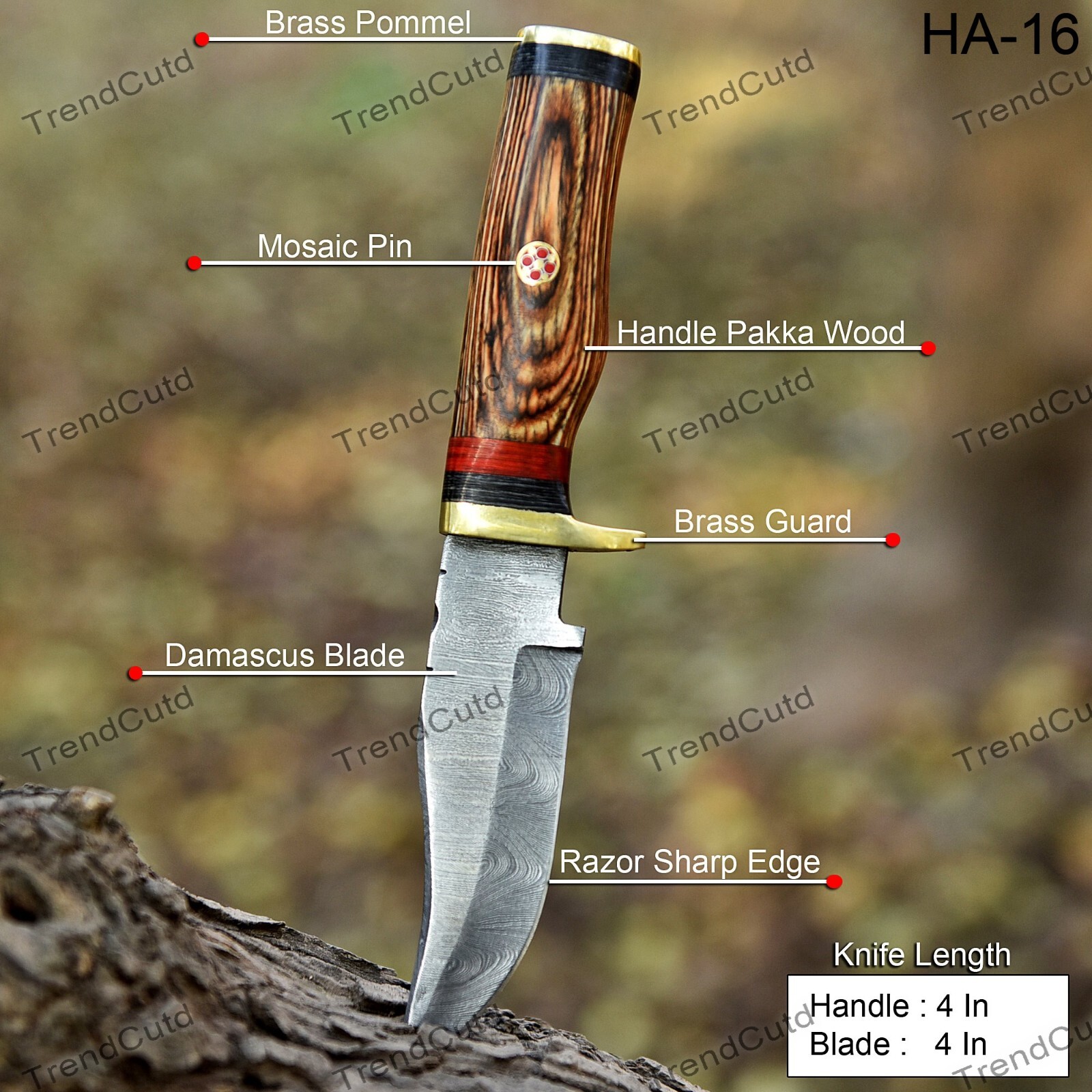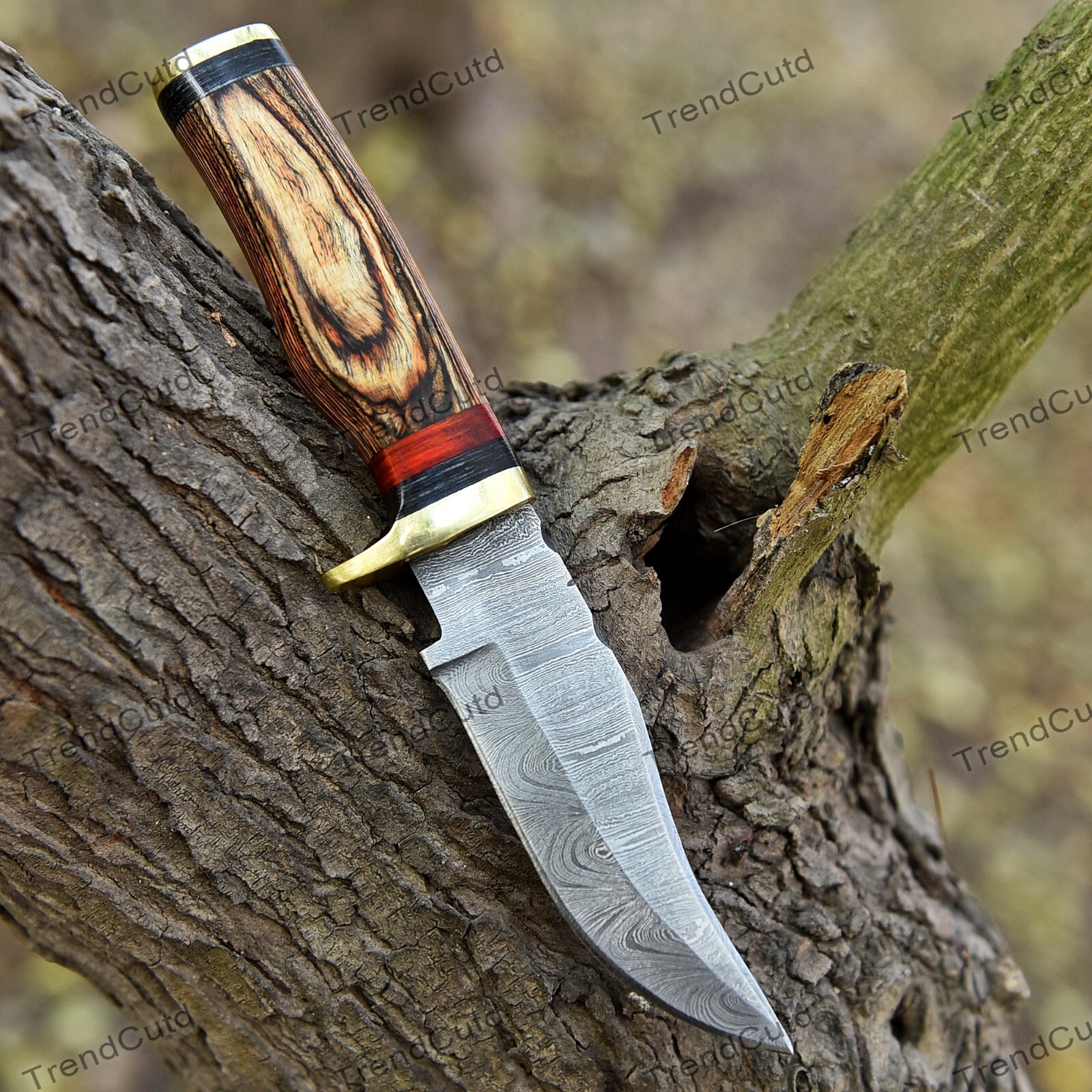 Custom Handmade Damascus Steel Skinner Hunting Knife KNIFE MATERIAL: Blade: Damascus Handle: Pakka Wood & Brass Pommal & Brass Guard KNIFE MEASUREMENT: Overall Length= 8" Blade Length= 4" Handle Length=4" Trendcutd knives are handmade you will get the same knife as in the photo. A slight difference can be there in color and patterns because these are handmade items and we use natural material. These knife have perfect grip sharp cutting edge which makes our knives more durable. Tips To Care For Knife: 1. Clean your knife with gasoline or Ethanol after use. 2. Apply oil on the blade after cleaning & using the knife. 3. Never store the knife in sheath for long time as it may dull the sharpness of knife over time. DISCLAIMER: If you have any issue regarding our products and services you can always contact us any time we will try to resolve your issue as quickly as possible. Best Regards, Trendcutd