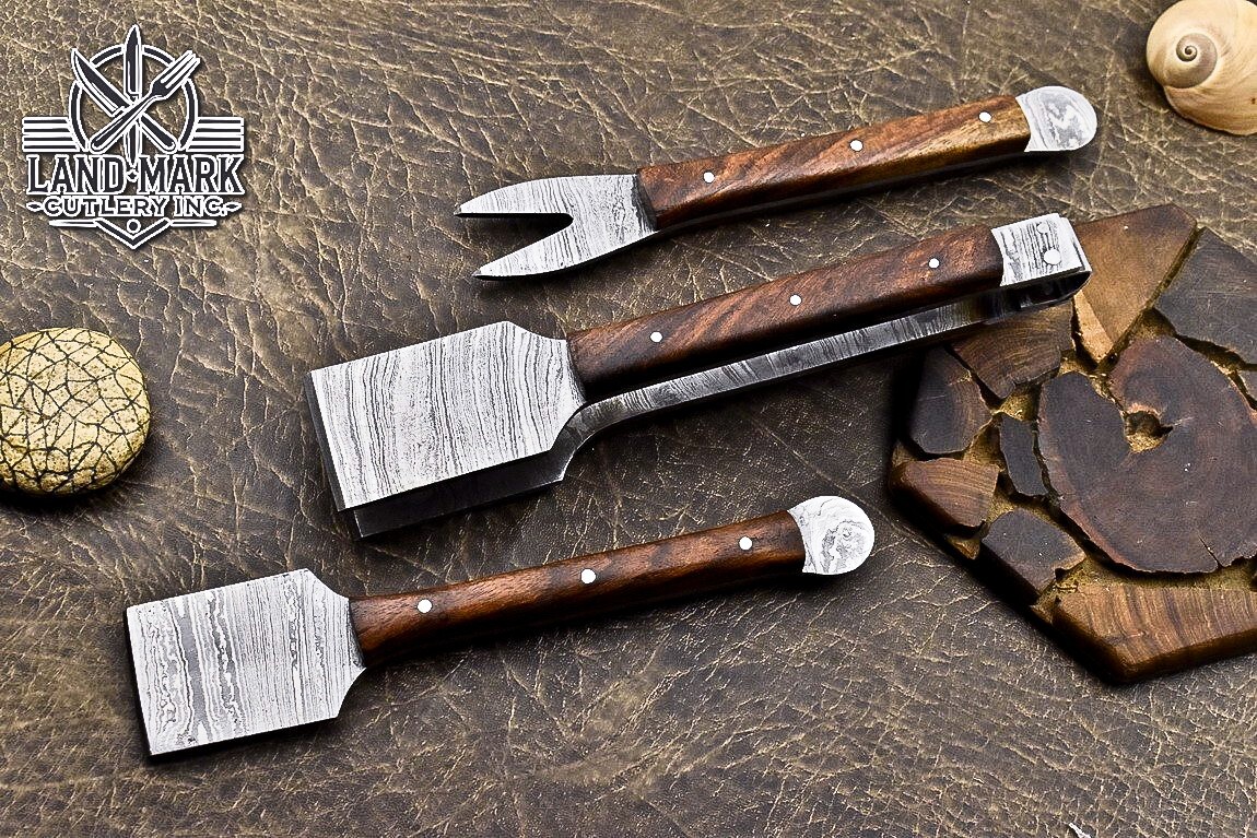Custom Hand Made DAMASCUS STEEL HUNTING BBQ SET WITH ROSE WOOD HANDLE We offer a shipping discount for More then one purchased . And discount will be apply on combine invoice, Discount will not apply on separate payment. ITEM DETAILS OVER ALL LENGTH 12.0 inches long (Approx) BLADE HARDNESS 58-60 HRC Which Holds The Sharp Edge For Long Time. HANDLE ROSE WOOD COVER NO This Awesome custom made KNIFE has a nice hand forged with the combination of 4340 & 1080 steel. HOW OUR DAMASCUS IS MADE: All our Damascus is real and not just an acid etch. Damascus is a mixture of 1080HC and 4340 nickel carbon. You heat them up together and then fold the bar over and over to get the desired layers, ours are 396 layers. Then you burn the blade in acid, and it turns the nickel satin color and the high carbon turns blackish gray. This is how the layers are exposed to show the layers of the new steel created coined "Damascus". All Damascus is acid etched to show the layers. If you high polish the metal it will be shinny satin like all steels. Only after you burn the sides of the blade with acid do you see the layers of the two steels. Makes sense? After we make our knives we high polish the handles and put an edge on the blade. The high polishing buffs off the acid burned layer of the handle, and the blade edge is sharpened and the acid burned edge becomes satin. You can re-burn the tang of the blade near the handles and the edge of the blade and it will show the layers once more. All our knives are hand made, durable and unique ***** YOU WILL RECEIVED THE SAME KNIFE Qality Standards Our Damascus blades are made from high quality non-stainless steels which rival or exceed any Damascus blade made from the 10 series with 4340. Our Damascus combination has taken years to perfect and has been tested under a variety of application which will offer professional performance in categories of toughness, strength (lateral stress) and edge honing and holding ability. In a 5 spot Rockwell test our blades will average near or close to 58 which offers a perfect balances between its toughness and strength.Our blades due to carbon content need to be regularly treated with wax and/or 3 in 1 oil to maintain its superior quality. Questions if you have any question feel free to send us message we aim to answer all questions within 24 hours Feedback If you are not satisfied with our service please contact us before leaving any negative or natural feedback. We will resolve all issues as quickly as possible. Disclaimer We are not responsible for any injuries associated with the use of our tools. Our products are intended for legal use only by responsible buyers. Therefore, we will not sell our products to anyone under the age of 18. Before bidding please check your country laws as some countries Custom don't allow this. If your purchase is held by Custom Authorities in your country/State we will not be responsible for that and no refund will be issued Shipping We offer a 20% shipping discount for More then one purchased . And discount will be apply on combine invoice, Discount will not apply on separate payment We ship within 24 hours after receiving complete payment but this can be delayed due to week ends or Governments and Religious Festivals . . This is beyond our control and we apologize for this inconvenience. Precautions Our Tools are very sharp so open and use them very carefully We are not responsible for any injuries associated with the use of our tools Tips to Care knife 1. NEVER STORE YOUR KNIFE FOR LONG TIME IN LEATHER SHEATH. 2. LEATHER CAN ABSORB WATER, WHICH WILL RUST THE KNIFE. 3. ALWAYS CLEAN THE BLADE AFTER USING WITH OIL OR WAX