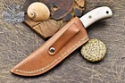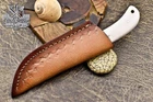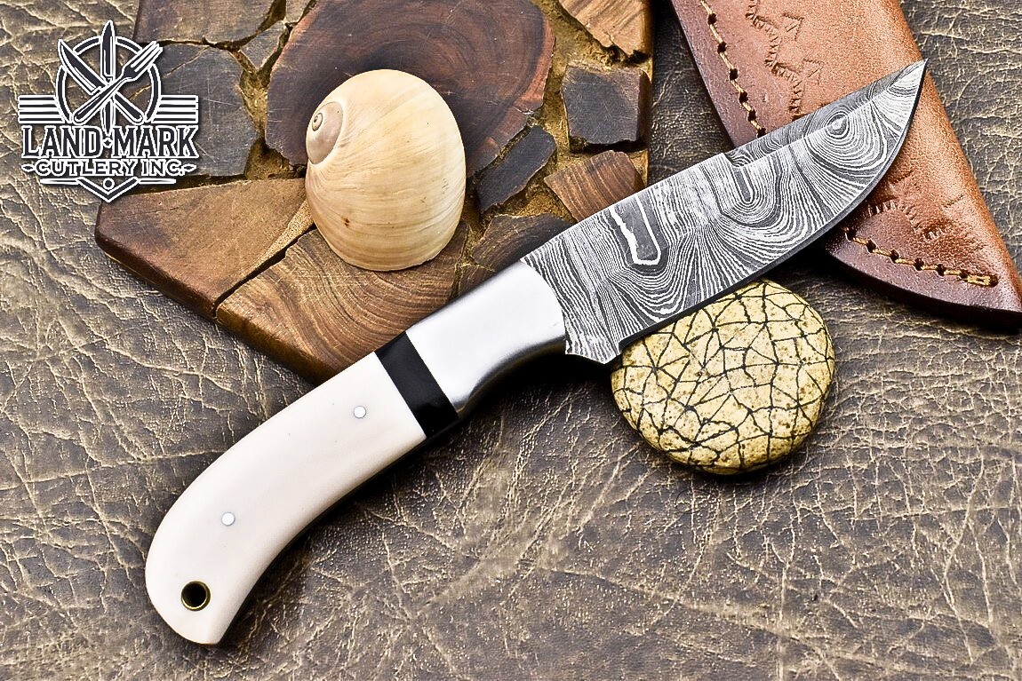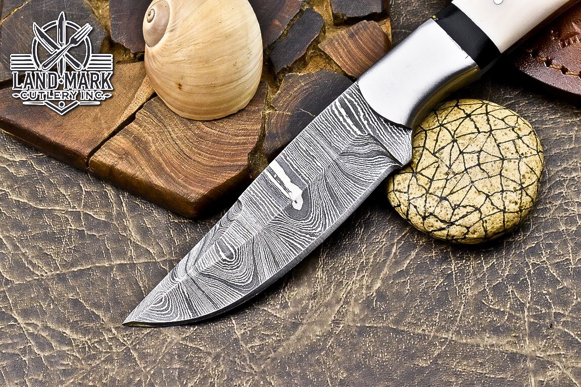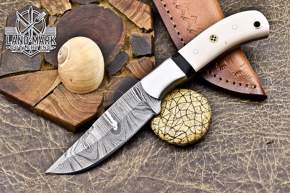 Custom Hand Made DAMASCUS STEEL HUNTING KNIFE WITH WHITE HANDLE We offer a shipping discount for More then one purchased . And discount will be apply on combine invoice, Discount will not apply on separate payment. ITEM DETAILS OVER ALL LENGTH 8.0 inches long (Approx) HANDLE LENGTH 4.0 inches long (Approx) BLADE LENGTH 4.0 inches long (Approx) BLADE HARDNESS 58-60 HRC Which Holds The Sharp Edge For Long Time. HANDLE RESIN COVER LEATHER SHEATH This Awesome custom made KNIFE has a nice hand forged with the combination of 4340 & 1080 steel. HOW OUR DAMASCUS IS MADE: All our Damascus is real and not just an acid etch. Damascus is a mixture of 1080HC and 4340 nickel carbon. You heat them up together and then fold the bar over and over to get the desired layers, ours are 396 layers. Then you burn the blade in acid, and it turns the nickel satin color and the high carbon turns blackish gray. This is how the layers are exposed to show the layers of the new steel created coined "Damascus". All Damascus is acid etched to show the layers. If you high polish the metal it will be shinny satin like all steels. Only after you burn the sides of the blade with acid do you see the layers of the two steels. Makes sense? After we make our knives we high polish the handles and put an edge on the blade. The high polishing buffs off the acid burned layer of the handle, and the blade edge is sharpened and the acid burned edge becomes satin. You can re-burn the tang of the blade near the handles and the edge of the blade and it will show the layers once more. All our knives are hand made, durable and unique ***** YOU WILL RECEIVED THE SAME KNIFE Qality Standards Our Damascus blades are made from high quality non-stainless steels which rival or exceed any Damascus blade made from the 10 series with 4340. Our Damascus combination has taken years to perfect and has been tested under a variety of application which will offer professional performance in categories of toughness, strength (lateral stress) and edge honing and holding ability. In a 5 spot Rockwell test our blades will average near or close to 58 which offers a perfect balances between its toughness and strength.Our blades due to carbon content need to be regularly treated with wax and/or 3 in 1 oil to maintain its superior quality. Questions if you have any question feel free to send us message we aim to answer all questions within 24 hours Feedback If you are not satisfied with our service please contact us before leaving any negative or natural feedback. We will resolve all issues as quickly as possible. Disclaimer We are not responsible for any injuries associated with the use of our tools. Our products are intended for legal use only by responsible buyers. Therefore, we will not sell our products to anyone under the age of 18. Before bidding please check your country laws as some countries Custom don't allow this. If your purchase is held by Custom Authorities in your country/State we will not be responsible for that and no refund will be issued Shipping We offer a 20% shipping discount for More then one purchased . And discount will be apply on combine invoice, Discount will not apply on separate payment We ship within 24 hours after receiving complete payment but this can be delayed due to week ends or Governments and Religious Festivals . . This is beyond our control and we apologize for this inconvenience. Precautions Our Tools are very sharp so open and use them very carefully We are not responsible for any injuries associated with the use of our tools Tips to Care knife 1. NEVER STORE YOUR KNIFE FOR LONG TIME IN LEATHER SHEATH. 2. LEATHER CAN ABSORB WATER, WHICH WILL RUST THE KNIFE. 3. ALWAYS CLEAN THE BLADE AFTER USING WITH OIL OR WAX