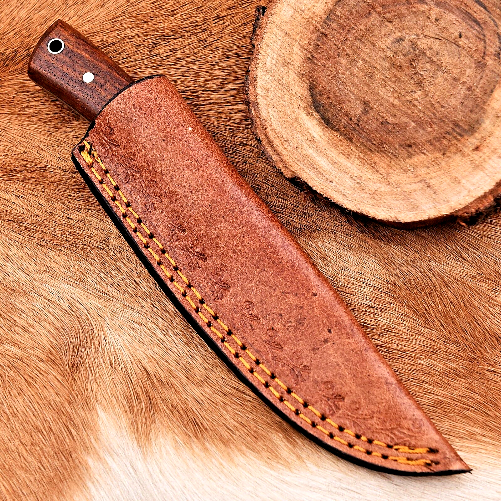 CUSTOM HAND MADE HIGH CARBON STEEL EVERY DAY CARRY SKINNER HUNTING KNIFE Wood Handle This superb design knife is hand forged. Blade of this knife has a nice file work. The balance and shape of this knife ensures perfect grip. Overall Length: 7.2” Inches Blade Length: 3.6 ”Inches Handle Length: 3.6 ”Inches Package Includes: with Leather Sheath Warning: Keep fingers clear of blades. Store away from children.