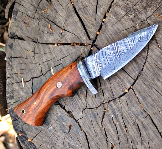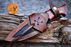 CUSTOM HAND MADE HAND FORGED DAMASCUS STEEL ENGRAVED BLADE HUNTING CAPMING TRACKER KNIFE Wood & Damascus Steel Guard Handle This superb design knife is hand forged. Blade of this knife has a nice file work and is made of 512 layers of 4340 stainless steel and 1075 high carbon steel and hardness 55-58 HRC . This robust knife is lab tested under intense conditions, the balance and shape of this knife ensures perfect grip. Overall Length: 10.5" Inches Blade Length: 5" Inches Handle Length: 5.5" Inches Damascus Design: Ladder Pattern Layers: 512 Package Includes: with Leather Sheath Warning: Keep fingers clear of blades. Store away from children.