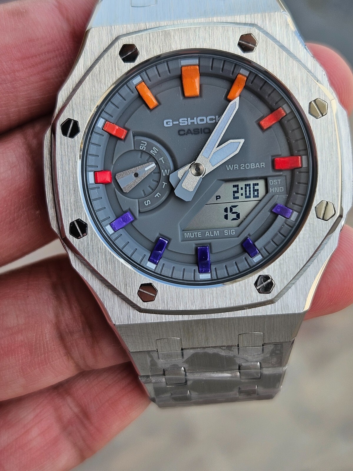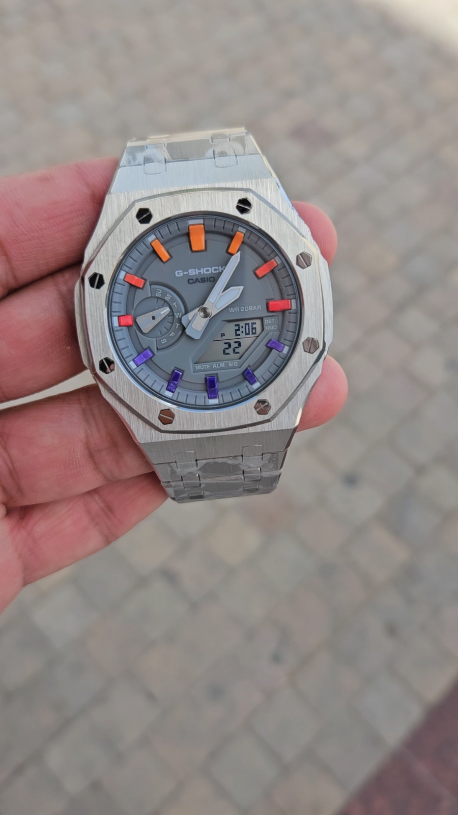Custom G-SHOCK GA-2100 Series Watch 100% Original Casio G-SHOCK Base Fully Modified with Stainless Steel Octagon Case & Bracelet Unique Rainbow Color Index Markers Grey Dial with Analog-Digital Display Water Resistant: 200M (20 BAR) MUTE | ALARM | SIGNAL Functions Shock Resistant | Durable Build Watch is Brand New – Custom Built Comes with original Box. Shipping: Ships Worldwide via Express Courier Ready to Dispatch within 24 hours Disclaimer: This is a fully customized watch using an original G-SHOCK GA-2100 base. Casio is not affiliated with the modifications. This is a unique custom build.