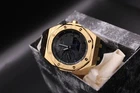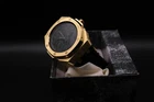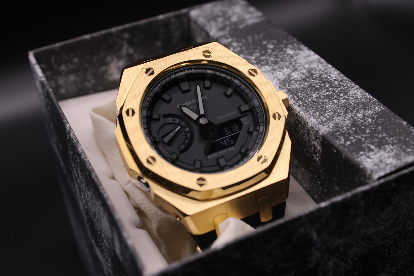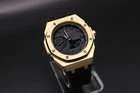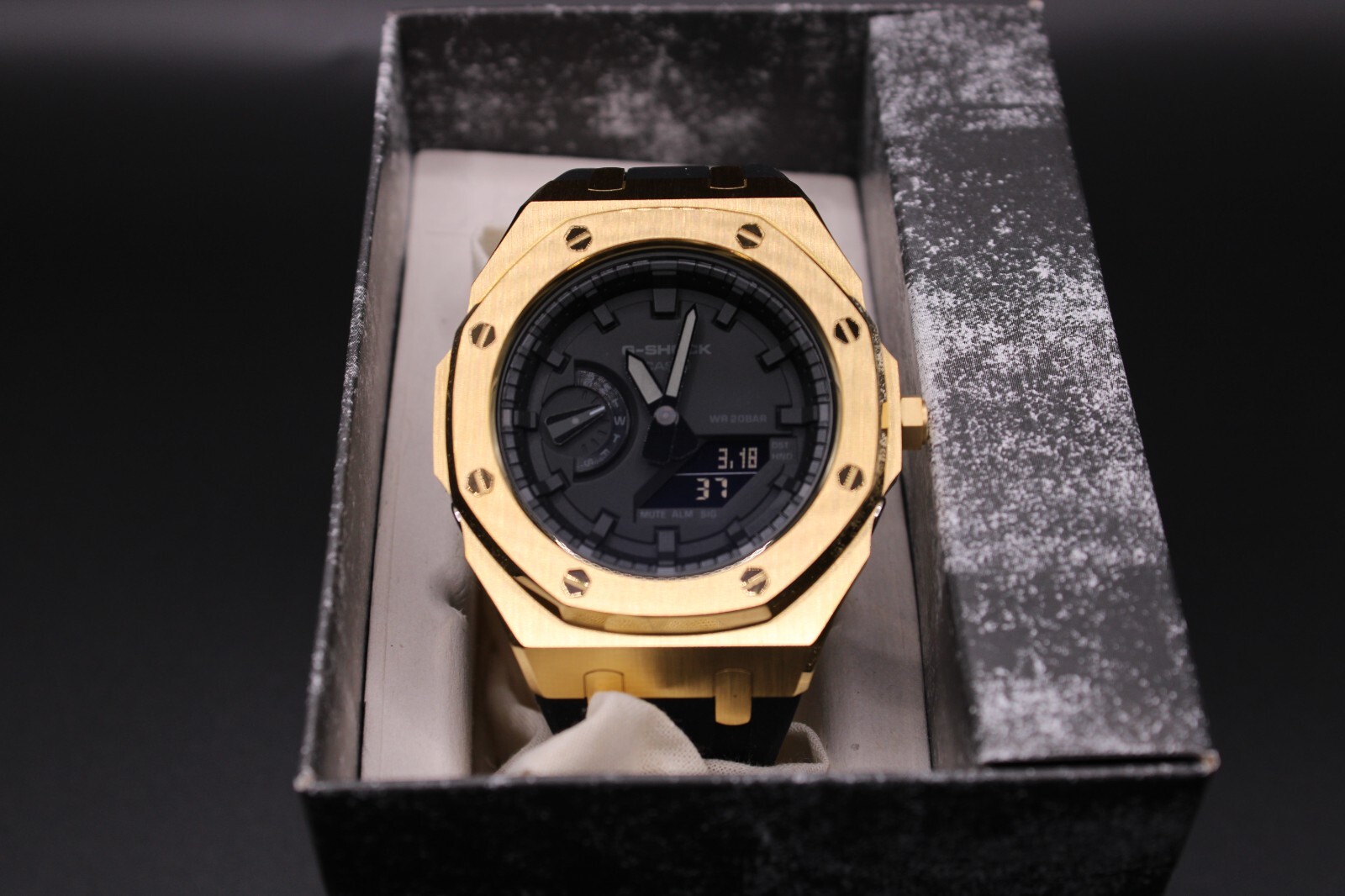 Crafted for the modern man, the Custom Gold G-Shock GA-2100 1a1 CasiOak wristwatch combines robust functionality with a sleek, sporty design. The black dial is accented by luminous stick indexes and a versatile butterfly clasp closure ensures a secure fit on the wrist. The watch boasts a array of features including water resistance up to 200 meters, a shock-resistant build, and a multi-functional alarm, all backed by a reliable quartz movement. Included with the original box and booklet, this watch is a testament to craftsmanship and style. Package Includes: Original G-shock ga2100 - 1a1 Watch and watch band (shown in picture) Original Box and packaging Custom gold and black rubber band Warranty and manual Flat Head and Philips head screwdriver used to change between bands screws *Casio G-Shock Ga2100-1A1 Watch is purchased through eBay, receipt can be provided if asked. Watch Crown serves no purpose