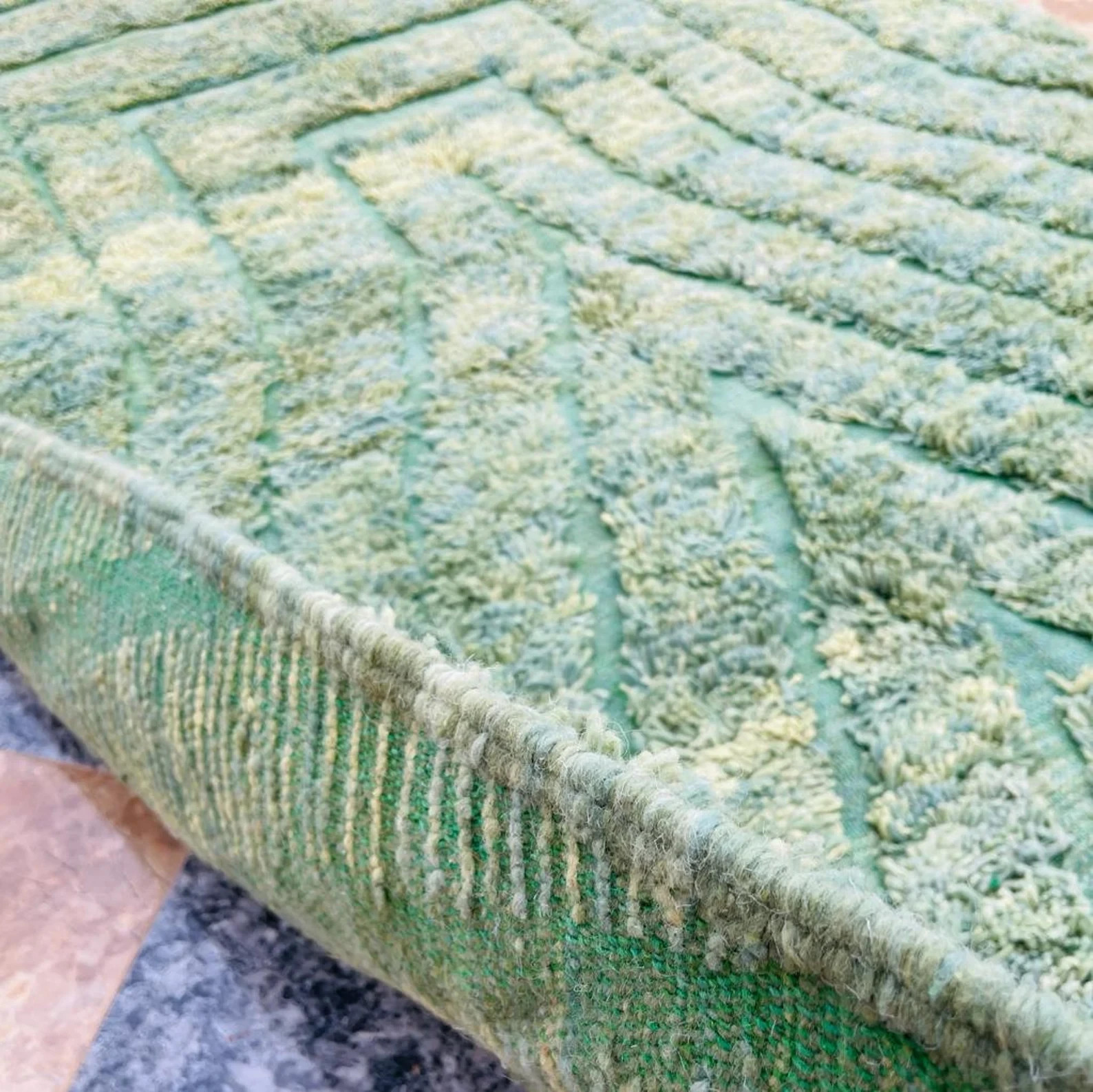 We are delighted with this beautiful rug, it is gorgeous, such great quality. The colour is true to the photo and is a lovely kind of moss green. It was very interesting tracking its journey all the way from Uttar Pradesh, which we didn't realise is known as rug town or city. I was worried about the packaging not holding up, but it was triple wrapped and sent via Fed Ex and arrived in perfect condition, other than a couple of rumples, which is to be expected. Well done and thank you!