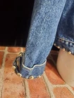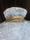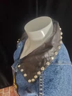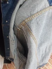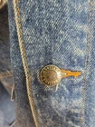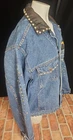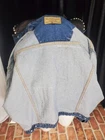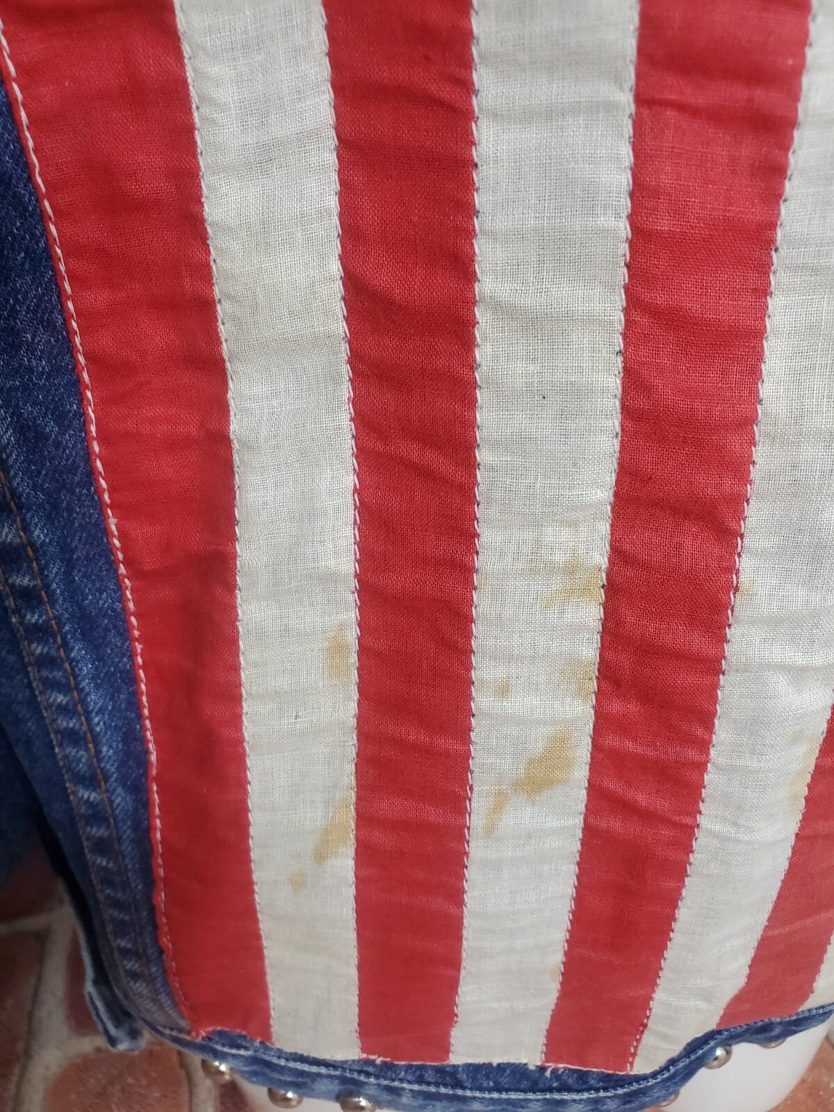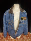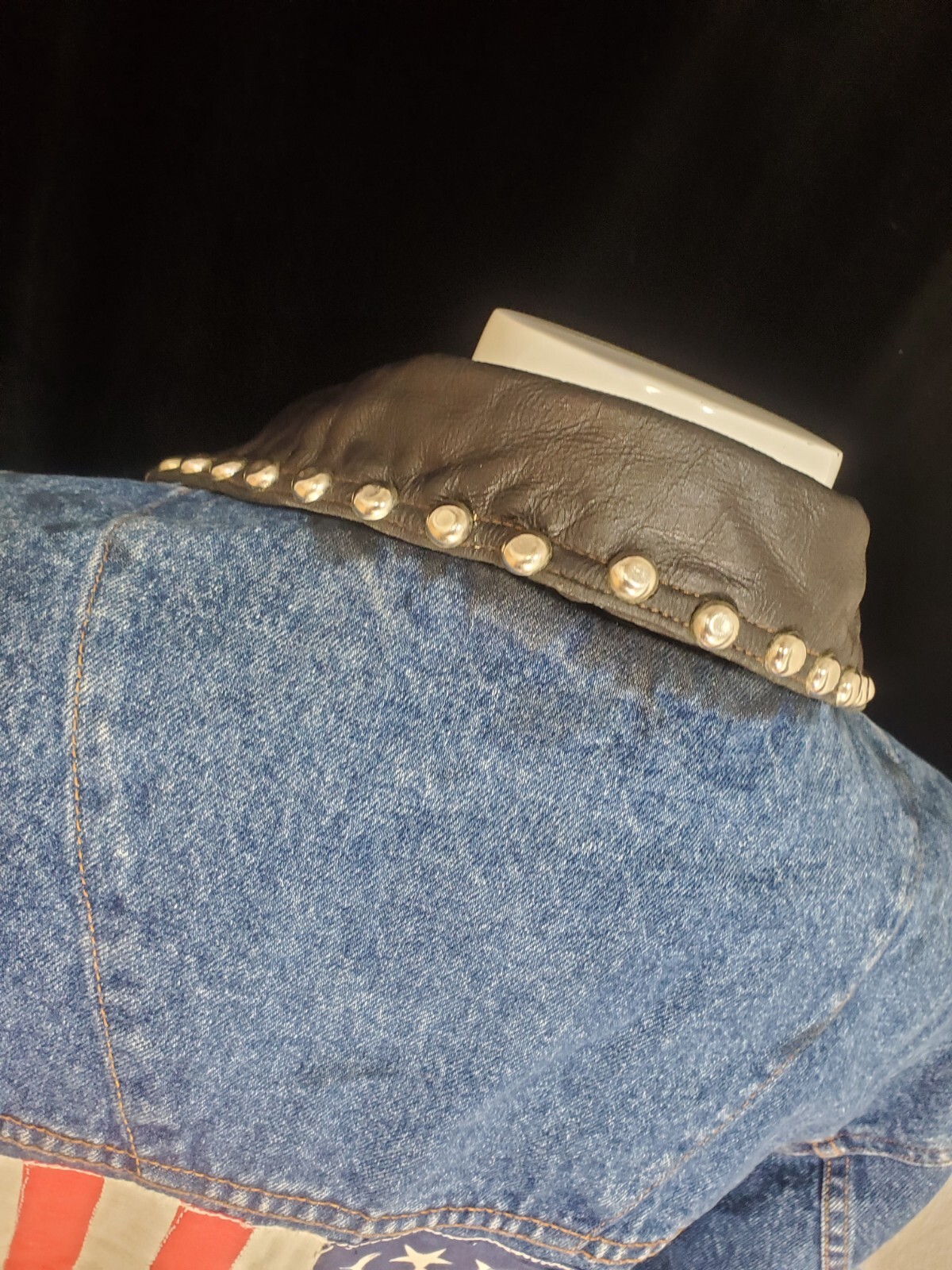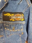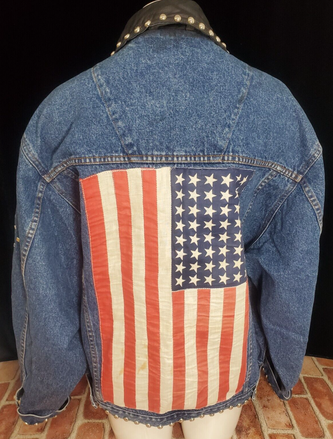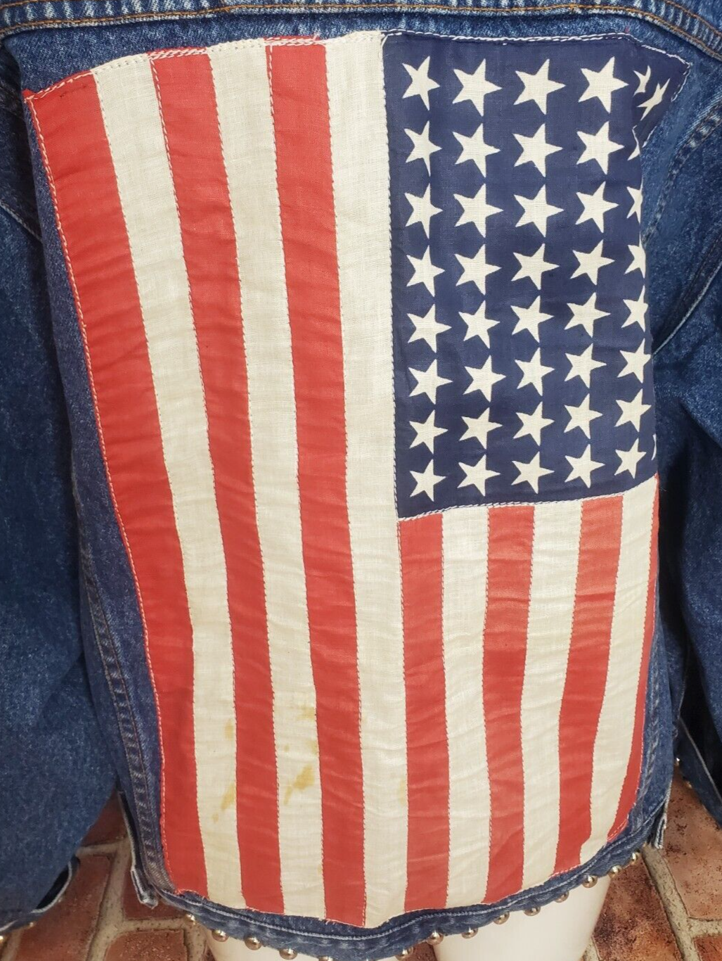 Personalized by hand Timberland Denim jacket with Harley Davidson patch and American flag on its back. Accented with metal studs and a dyed black collar. This jacket is hand designed. As such imperfections in dye and stud pattern can be found. The dye has gotten on both sides of the collar. If you look at the pictures carefully you will see a few other spots where the dye has landed. We are not 100% sure that originally this Timberland denim jacket was a woman's cut. Please refer to measurements I am going to provide for proper sizing. The flag on the back of the jacket does have a watermark stain on it. We did try washing it. It did not come out. Lots of metal studs adorn the collar, sleeves and waist. While not in perfect condition this jacket absolutely conveys the feeling of freedom and liberty along with dreams of the open road. Measurements are as follows, Armpit to armpit: 26" Shoulders: 22" Sleeves: 23" cuffed. Back of neck/nape to hemline: 27" Please check that measurements will work for you. I believe this is meant to ride very baggy or even open. One of a kind piece. Denim, Flag, Biker, Timberland Jacket. Please see all pictures prior to purchase.
