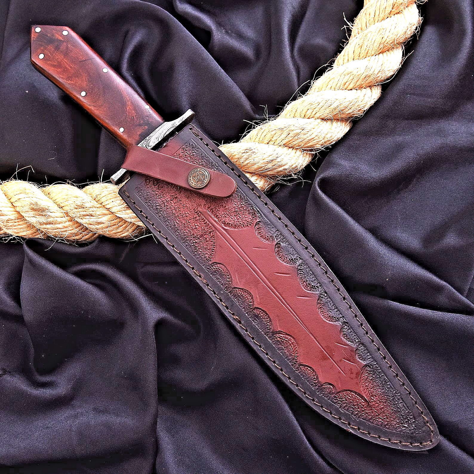 CUSTOM HAND MADE HUNTING CAMPING SURVIVAL BOWIE KNIFE HAND FORGED DAMASCUS STEEL BLADE Wood Handle This superb design knife is hand forged. Blade of this knife has a nice file work and is made of 512 layers of 4340 stainless steel and 1075 high carbon steel and hardness 55-58 HRC . This robust knife is lab tested under intense conditions, the balance and shape of this knife ensures perfect grip. Overall Length: 15" Inches Blade Length: 10" Inches Handle Length: 5" Inches Damascus Design: Raindrop Pattern Layers: 512 Hardness: 55-58 HRC Package Includes: with Leather Sheath Warning: Keep fingers clear of blades. Store away from children.