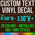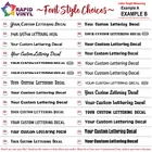 Custom Text Vinyl Lettering Sticker Decal Window Trailer Business Car Name Boat Custom Text Vinyl Lettering Sticker Decal Window Trailer Business Car Name Boat Rapid Vinyl Custom Vinyl Letters & Designs Made to Order. Create your personalized DIY decal! For homeowners, vinyl designs provide an option for elegant, classy yet different décor. Business owners can use the custom vinyl lettering service to design their logos, decorate their walls or have their contact information displayed on their vehicles and businesses. Order Instructions: Step 1: Select Size, Select Color, Change quantity and place an order Step 2: Send us an eBay message with your Custom Text, Lettering, Numbers, Max Length & Font Style Up to 20 characters per single order quantity of 1 Product Details: Custom made to order lettering transfer decals using your information. No Background 6 Year semi-permanent adhesive rating / withstands outdoor elements Will ship pre-spaced and ready to apply, letters are not individual You may cut the decal to create individual letters, sections, or groups (if not a script style/touching font style) Up to 20 characters per order for sizes .50" High through 3.5" High (Larger Sizes - Click Here ) Example Text: "Rapid Vinyl Chrome" = 16 Characters (Order Quantity 1) Example Text: "Rapid Vinyl Sells Vinyl Decals" = 26 Characters (Order Quantity 2) Letters, Numbers, Symbols and Exsessive Spaces count as characters Solid one color per order - If you need something customized, send us a message for a quote Sizes are measured by lettering height (Top of the tallest letter to the bottom of the lowest letter) Length depends on your text, phrase, word, sentence, and font selected If you have a max length restriction per phrase, word, line of words, etc let us know This is NOT a peel and stick pack of the alphabet Recommended use outdoors; car, truck, boat, trailer, glass, window, windshield, special projects, hobby, and more For indoor applications; walls, temporary projects, and removable vinyl visit our indoor listing For sizes larger than 3.5" High, please visit this listing For sizes 12" High through 22" High, please visit this listing For Chrome custom lettering, please visit this listing Installation instructions ship with the decal If you have any questions, send us a message Other Services & Info: Shipping is FREE on most orders and always FREE if you spend $10.00 or more Custom Requests may be requested via a message, not included with standard orders Upgrade to USPS Priority 2-3 Day Shipping during checkout for only $9.95! Orders over $75.00 receive free expedited shipping USPS Priority For Other Vinyl Sizes & Decals Visit our eBay Store Here To preview your text with our fonts google search "rapid vinyl font preview tool links" Lettering Decal Production Process: The Vinyl Lettering Process is simple: You send us the details for your vinyl lettering project and we turn it into a custom transfer decal. The key information we need to collect from you is 1) Size, 2) Color, 3) Text, Numbers, Phrase, Words, Symbols, 4) Font Style, 5) Max length as required. We then process this information using computer aided tools to create a vector file. We send this vector file to our cutter/plotter. This physical cutter cuts the outlines of your decal. We then weed the decal by pulling all of the excess vinyl off of the backing. Once complete we then cover with decal with transfer tape. The item is then shipped directly to you for application! Frequently Asked Questions: What is the difference between a decal and a sticker? - Lettering & Design decals are typically created using the method explained above and are single color unless layered to create an effect. Stickers are often referred to as a full color custom image or graphic design that is printed onto vinyl first, and then cut to a shape and size. This creates a sticker. Often stickers are ordered in large quantities because we need to process using a printer & cutter. Custom printed stickers are offered with minimum order quantities for a better price. How fast will you ship my Personalized Lettering Decal? - We process most all orders within 1-3 business days! Larger orders take a bit longer. The sooner we receive your details the sooner we are able to process and ship your custom decal! Am I able to use a different font style that what you offer? - Yes. However please keep in mind that the fancier the font the more time it takes our team to weed, thus we may charge more to produce your decal. You should also keep in mind that if you use a font style that has thin lines, the thinner the actual area of adhesion to the surface becomes. The install also becomes more delicate. Where is your font preview design tool located? - We have to host this off of eBay and are unable to share the link to this tool until after you have placed an order. We comply with eBay policies in this regard. We do have font images in the listing showing some of our font styles available but we have many more than the image quantity allows. We also believe it's a huge benefit to see your custom text displayed in the font of your choosing. If you have a valid email address on file with eBay, you will receive the link to the "Rapid Vinyl Font Preview Tool" after an order is placed. We are not permitted to share this link with you before an order is placed on eBay or through eBay messaging. What vinyl types do you offer on eBay? - We have 3 distinct types; Indoor Matte Finish, Outdoor/Indoor Gloss Finish, and Chrome Metal Finish. Indoor will last for many years and is cleanly removable for up to 2 years w/o damaging walls for example. Outdoor has a stronger adhesive and is made to weather the elements for 4-6 years. Chrome is a metal foil like material and also has a rating of 4-6 years. We can obtain other high performance vinyl types for custom orders. Higher performance vinyls will run higher in pricing depending on quantity and type wanted. What we offer here on eBay is 
