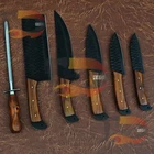 CUSTOM HAND FORGED STAINLESS STEEL BLACK COATED CHEF KITCHEN KNIFE SET Type: BBQ Knife/Chef's Knife Handle Material: Wood with Steel Bolsters with Mosaic pins Blade Material: Hand Forged Stainless Steel Black coated 15N20 and 1095 Carbon Steel Leather Sheath: Original leather Sheath made of Suede leather it is also called leather Roll Overall Length : 13.5"-12.5"-10.5"-10.5"-9.5" Inches Blade Length: 8"-8"-6"-6"-5" inches Handle Length: 4.5" Inches Knife Type: Kitchen / chef knife Note: This is a catalog picture. You will receive the knife as shown in the picture but the blade patterns and handle material may vary slightly due to natural material used. This item is hand forged! Tips to care the Knife Do Not put the knife in the pouch for very long time.It can take rust due to high Carbon. Use oil on the blade after use. Always clean your knife after use Complimentary gift messages *Gift wrapping service available for minimal additional fee ADD ONS: *Custom orders for 10 or more pieces. You can choose & submit your own handle or design. LIFETIME WARRANTY No premium knife is complete without a lifetime warranty; our masterpiece knife is fully covered for life, We do sell wholesale, please contact us for special discounts on bulk orders. FEEDBACK POLICY: YOUR FEEDBACK IS VERY IMPORTANT FOR US, IF THEIR IS ANY KIND OF PROBLEM PLEASE GIVE US OPPORTUNITY TO SORT THE ISSUE