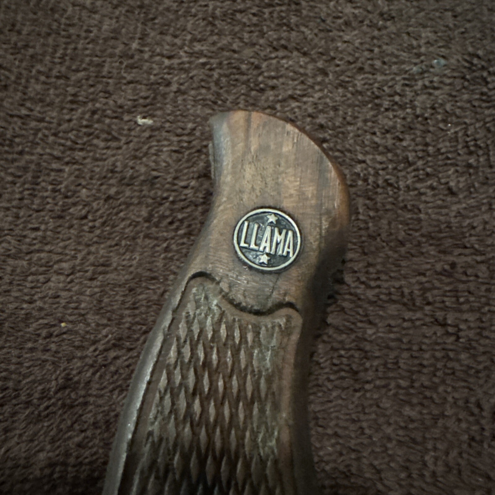 The product is a set of Llama brand wood grips designed for a Llama martial revolver. These OEM grips are made in the United States and feature a brown color. They are specifically designed for a handgun and provide a classic, wooden grip for the firearm.
