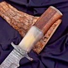CUSTOM HAND MADE HAND FORGED DAMASCUS STEEL BOWIE HUNTING KNIFE SURVIVAL CAMPING HIKING BUSHCRAFT CAMEL BONE & WOOD WITH DAMASCUS STEEL GUARD HANDLE This superb design knife is hand forged. Blade of this knife has a nice file work and is made of 512 layers of 4340 stainless steel and 1075 high carbon steel and hardness 55-58 HRC . This robust knife is lab tested under intense conditions, the balance and shape of this knife ensures perfect grip. Overall Length: 15" Inches Blade Length: 10" Inches Handle Length: 5" Inches Damascus Design: Ladder Pattern Layers: 512 Sheath: Leather Hardness: 55-58 HRC Package Includes: with Leather Sheath Warning: Keep fingers clear of blades. Store away from children.