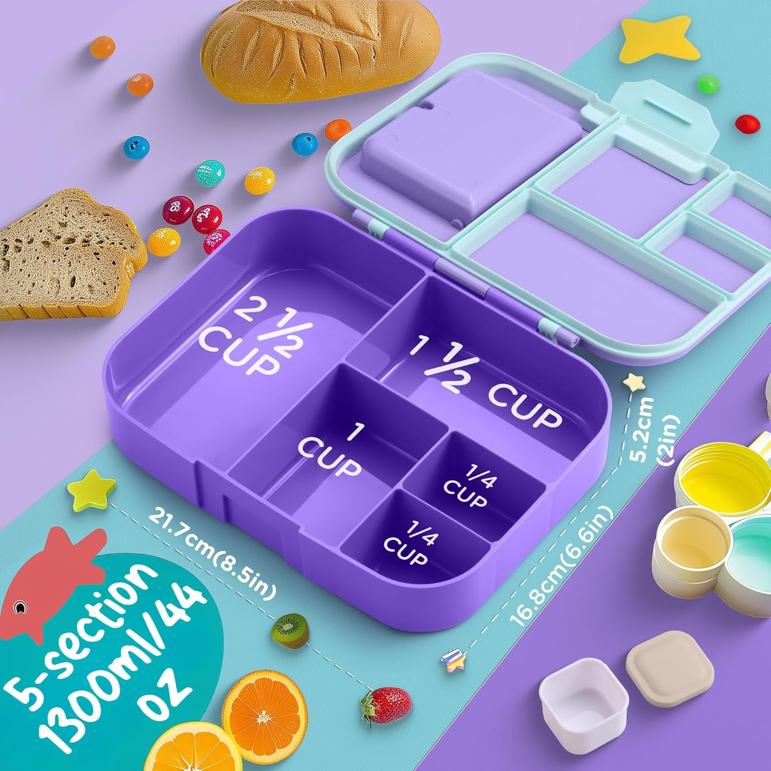 Kawaii Lunch Box Set for Kids: This bento box set includes a 1300ml (44oz/5.5-cup) lunch box, a sauce cup, a foldable fork and spoon, and a beautifully designed gift box—everything your child needs for school or outings! Vibrant Design for Fun Mealtimes: With bold purple and blue colors, this lunch box makes mealtime exciting! The five compartments are perfect for colorful, balanced meals, encouraging your child to try new foods and share with friends—making every meal an adventure! Microwave & Dishwasher Safe with Removable Silicone Seal: Reminder: When microwaving, keep the lid loose to allow steam to escape. The removable silicone seal is designed for easy cleaning but may require a bit of patience or help from parents when reinstalling to ensure it fits snugly for leak-proof protection. Certified Child-Safe & Kid-Friendly: Safety is our top priority! This Lunchable Container is CPC-certified, ensuring it is non toxic. The secure clasp and easy-to-carry handle makes it simple for kids to open, close, and take on the go. Plus, it fits easily into most standard lunch bags. We’re Here to Help: If you notice any damage or missing parts, please don't hesitate to let us know. We're committed to resolving any issues quickly and ensuring your experience with our product is a positive one. Bento Box for Kids, Cute Lunch Box Containers for Girls, Toddler School Lunch Box for Daycare with 5 Compartments, Kids Lunchbox Container with Utensils and Sauce Cup, Purple