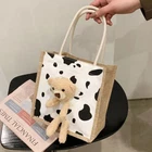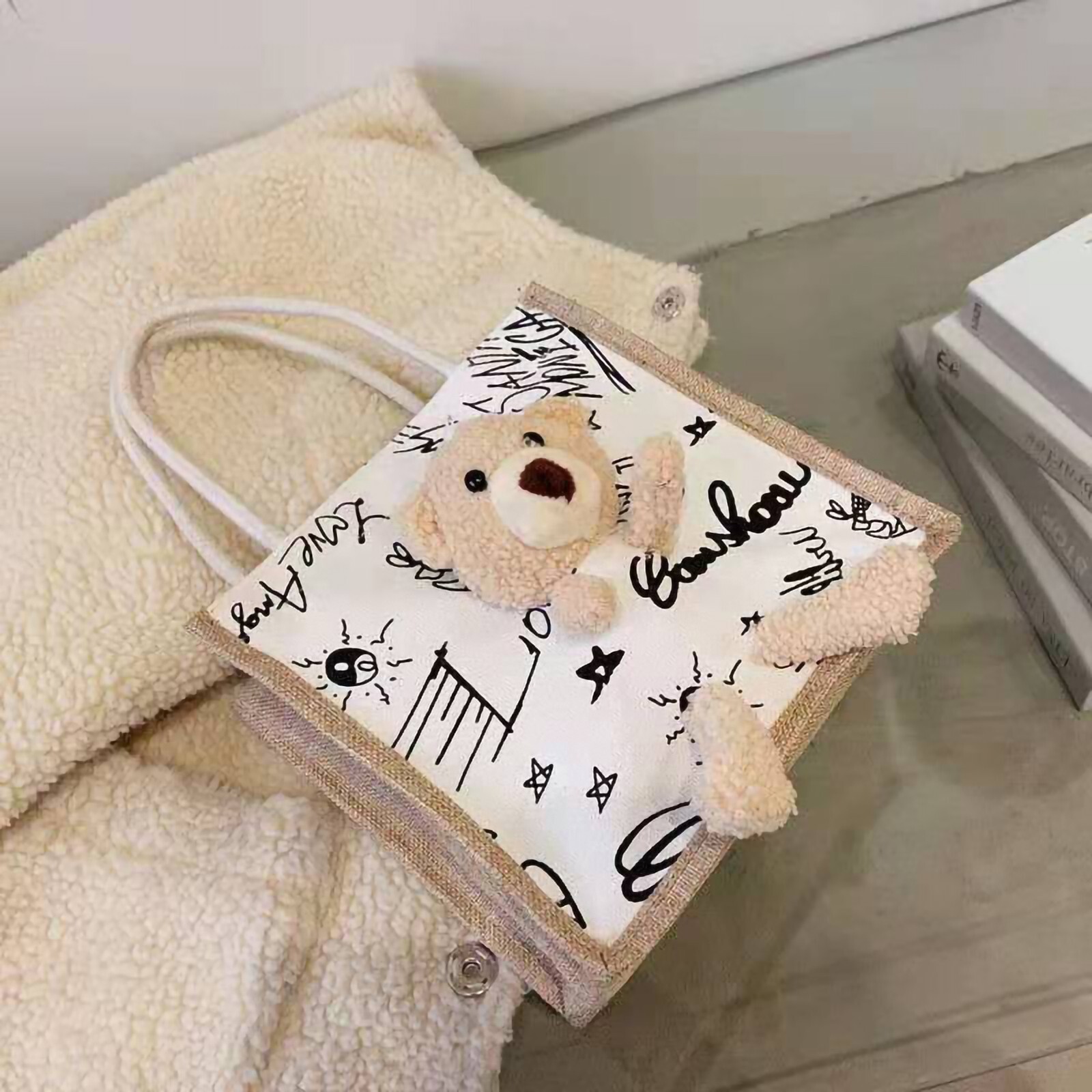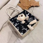 Feature: 1. Wide Range Of Applications: Reusable tote bag is perfect for students and office workers, can be used to store lunch boxes, cell phones, wallets, keys, etc. 2. Bear Toy On The Bag: Fashionable color matching, not easy to fade, overall looks cute and exquisite, attract people's attention, beautiful and practical. 3. Wonderful Gift: Smooth zipper for easy opening and closing. Non slip handle, easy to hold. Perfect gift for loved one, relatives, friends, sisters, colleagues etc on birthday. 4. Multiple Applicable Scenarios: Tote bag is lightweight and foldable, easy to carry, perfect for picnics, beach parties, day trips, outdoor activities and other scene. 5. Canvas Fabric: Handbag adopts high quality canvas fabric, safe and eco friendly, soft and skin friendly, wear resistant, easy to clean, has a long service life. Specification: Item Type: Handbag Material: Canvas Package List: 1 x Handbag